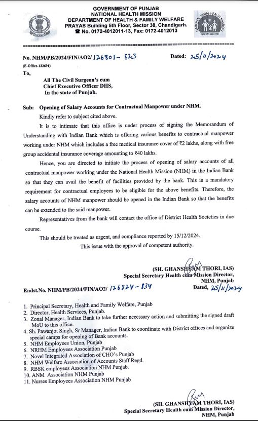 ਪੰਜਾਬ ਸਰਕਾਰ ਵੱਲੋਂ ਮੁਲਾਜ਼ਮਾਂ ਨੂੰ ਇੰਡੀਅਨ ਬੈਂਕ ’ਚ ਖਾਤੇ ਖੁੱਲ੍ਹਵਾਉਣ ਲਈ ਪੱਤਰ ਜਾਰੀ ਪੰਜਾਬ ਨਵੰਬਰ 25, 2024ਨਵੰਬਰ 25, 2024Leave a Comment on ਪੰਜਾਬ ਸਰਕਾਰ ਵੱਲੋਂ ਮੁਲਾਜ਼ਮਾਂ ਨੂੰ ਇੰਡੀਅਨ ਬੈਂਕ ’ਚ ਖਾਤੇ ਖੁੱਲ੍ਹਵਾਉਣ ਲਈ ਪੱਤਰ ਜਾਰੀ ਚੰਡੀਗੜ੍ਹ, 25 ਨਵੰਬਰ, ਦੇਸ਼ ਕਲਿੱਕ ਬਿਓਰੋ : ਪੰਜਾਬ ਸਰਕਾਰ ਵੱਲੋਂ ਸਿਹਤ ਵਿਭਾਗ ਵਿੱਚ ਠੇਕਾ ਅਧਿਕਾਰਤ ਮੁਲਾਜ਼ਮਾਂ ਨੂੰ ਇੰਡੀਅਨ ਬੈਂਕ ’ਚ ਖਾਤੇ ਖੁੱਲ੍ਹਵਾਉਣ ਲਈ ਪੱਤਰ ਜਾਰੀ ਕੀਤਾ ਗਿਆ ਹੈ।