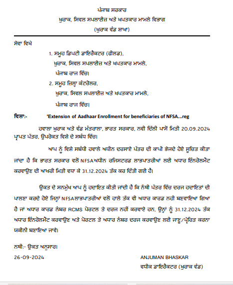 ਪੰਜਾਬ ‘ਚ ਸਰਕਾਰੀ ਡਿੱਪੂਆਂ ਤੋਂ ਰਾਸ਼ਨ ਲੈਣ ਵਾਲਿਆਂ ਲਈ ਜਾਰੀ ਹੋਏ ਨਵੇਂ ਹੁਕਮ ਪੰਜਾਬ ਸਤੰਬਰ 28, 2024ਸਤੰਬਰ 28, 2024Leave a Comment on ਪੰਜਾਬ ‘ਚ ਸਰਕਾਰੀ ਡਿੱਪੂਆਂ ਤੋਂ ਰਾਸ਼ਨ ਲੈਣ ਵਾਲਿਆਂ ਲਈ ਜਾਰੀ ਹੋਏ ਨਵੇਂ ਹੁਕਮ ਚੰਡੀਗੜ੍ਹ, 28 ਸਤੰਬਰ, ਦੇਸ਼ ਕਲਿਕ ਬਿਊਰੋ :ਪੰਜਾਬ ‘ਚ ਸਰਕਾਰੀ ਡਿੱਪੂਆਂ ਤੋਂ ਰਾਸ਼ਨ ਪ੍ਰਾਪਤ ਕਰਨ ਵਾਲਿਆਂ ਲਈ ਨਵੇਂ ਹੁਕਮ ਜਾਰੀ ਹੋਏ ਹਨ :-