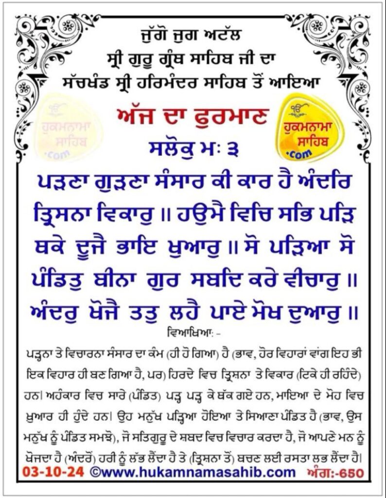 ਅੰਮ੍ਰਿਤ ਵੇਲੇ ਦਾ ਹੁਕਮਨਾਮਾ, ਸ੍ਰੀ ਦਰਬਾਰ ਸਾਹਿਬ ਅੰਮ੍ਰਿਤਸਰ,03-10-2024