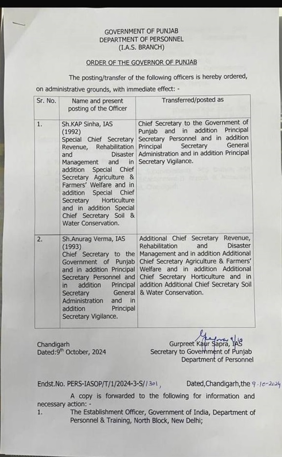 ਪੰਜਾਬ ਸਰਕਾਰ ਵੱਲੋਂ ਅੱਜ ਜਾਰੀ ਕੀਤੇ ਹੁਕਮਾਂ ਅਨੁਸਾਰ ਪੰਜਾਬ ਦੇ 1992 ਬੈਚ ਦੇ ਸੀਨੀਅਰ ਆਈ ਏ ਐਸ ਅਧਿਕਾਰੀ ਕੇ ਏ ਪੀ ਸਿਨਹਾ ਨੂੰ ਅਨੁਰਾਗ ਵਰਮਾ ਦੀ ਥਾਂ ਪੰਜਾਬ ਦੇ ਮੁੱਖ ਸਕੱਤਰ ਲਾਇਆ ਗਿਆ ਹੈ ਅਤੇ ਅਨੁਰਾਗ ਵਰਮਾ ਨੂੰ ਵਧੀਕ ਮੁੁੱਖ ਸਕੱਤਰ ਮਾਲ ਤੇ ਮੁੜ ਬਸੇਵਾ, ਵਧੀਕ ਮੁੱਖ ਸਕੱਤਰ ਖੇਤੀ ਬਾੜੀ ਤੇ ਕਿਸਾਨ ਭਲਾਈ ਵਿਭਾਗ, ਵਧੀਕ ਮੁੱਖ ਸਕਤਰ ਬਾਗਵਾਨੀ ਅਤੇ ਵਧੀਕ ਮੁੱਖ ਸਕੱਤਰ ਸੋਇਲ ਤੇ ਵਾਟਰ ਕੰਜਰਵੇਸ਼ਨ ਲਾਇਆ ਗਿਆ ਹੈ।