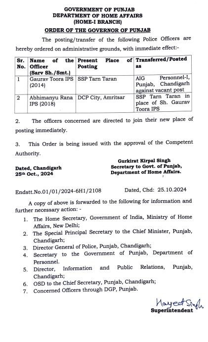 ਪੰਜਾਬ ਸਰਕਾਰ ਵੱਲੋਂ 2 IPS ਅਧਿਕਾਰੀਆਂ ਦੀਆਂ ਬਦਲੀਆਂ ਕੀਤੀਆਂ ਗਈਆਂ ਹਨ।