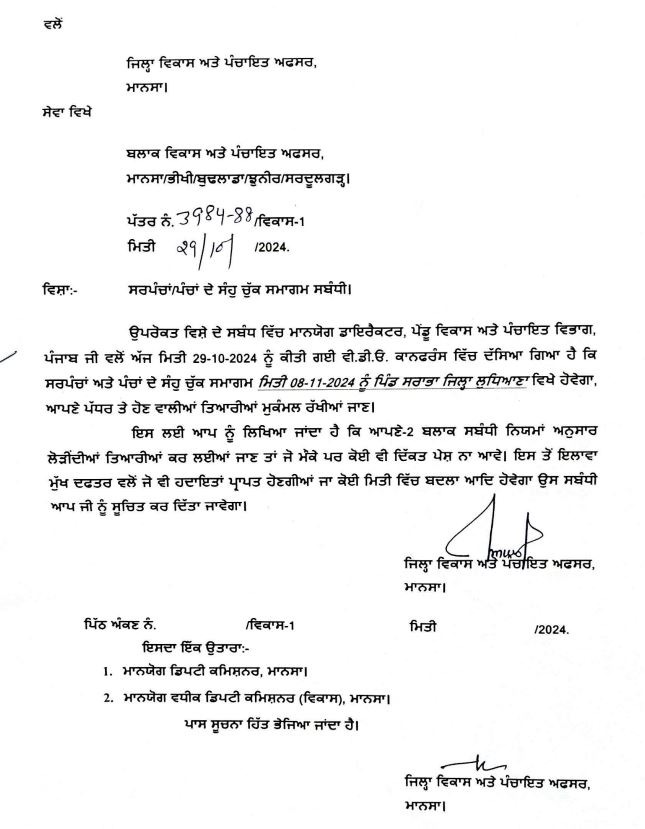 ਪੰਜਾਬ ਵਿੱਚ ਹੋਈਆਂ ਗ੍ਰਾਮ ਪੰਚਾਇਤਾਂ ਦੀਆਂ ਚੋਣਾਂ ਵਿੱਚ ਨਵੇਂ ਚੁਣੇ ਗਏ ਸਰਪੰਚਾਂ ਤੇ ਪੰਚਾਂ ਦੇ ਸੰਹੁ ਚੁੱਕ ਸਮਾਗਮ ਸਬੰਧੀ ਸਰਕਾਰ ਨੇ ਤਿਆਰੀਆਂ ਸ਼ੁਰੂ ਕਰ ਦਿੱਤੀਆਂ ਹਨ। ਸਰਪੰਚਾਂ ਤੇ ਪੰਚਾਂ ਨੂੰ 8 ਨਵੰਬਰ 2024 ਨੂੰ ਸੰਹੁ ਚੁੱਕ ਸਮਾਗਮ ਹੋਵੇਗਾ। ਇਹ ਸਮਾਗਮ ਪਿੰਡ ਸਰਾਭਾ ਜ਼ਿਲ੍ਹਾ ਲੁਧਿਆਣਾ ਵਿਖੇ ਹੋਵੇਗਾ। ਇਸ ਸਬੰਧੀ ਡਾਇਰੈਕਟਰ, ਪੇਂਡੂ ਵਿਕਾਸ ਤ ਪੰਚਾਇਤ ਵਿਭਾਗ ਪੰਜਾਬ ਵੱਲੋਂ ਜ਼ਿਲ੍ਹਾ ਵਿਕਾਸ ਵਿਕਾਸ ਤੇ ਪੰਚਾਇਤ ਅਫਸਰਾਂ ਨਾਲ ਵੀਡੀਓ ਰਾਹੀਂ ਕਾਨਫਰੰਸ ਵੀ ਕੀਤੀ ਗਈ ਹੈ।