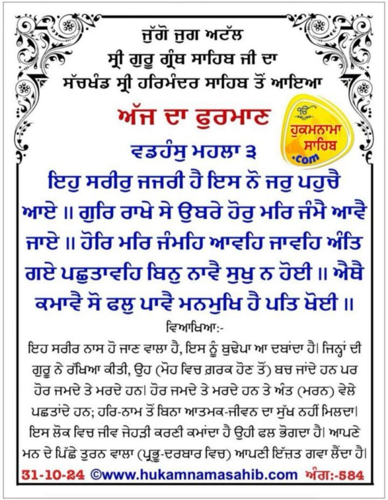 ਵਡਹੰਸੁ ਮਹਲਾ ੩ ॥ਹੇ ਭਾਈ! ਇਹ ਸਰੀਰ ਪੁਰਾਣਾ ਹੋ ਜਾਣ ਵਾਲਾ ਹੈ, ਇਸ ਨੂੰ ਬੁਢੇਪਾ ਜਰੂਰ ਆ ਦਬਾਉਂਦਾ ਹੈ, ਪਰ ਮਨੁੱਖ ਇਸ ਸਰੀਰ ਦੇ ਮੋਹ ਵਿਚ ਫਸਿਆ ਰਹਿੰਦਾ ਹੈ, ਜਿੰਨੑਾਂ ਮਨੁੱਖਾਂ ਦੀ ਗੁਰੂ ਨੇ ਰੱਖਿਆ ਕੀਤੀ, ਉਹ ਮੋਹ ਵਿਚ ਗ਼ਰਕ ਹੋਣ ਤੋਂ ਬਚ ਜਾਂਦੇ ਹਨ। ਜੇਹੜਾ ਮਨੁੱਖ ਗੁਰੂ ਦੀ ਸ਼ਰਨ ਨਹੀਂ ਆਉਂਦਾ ਉਹ ਇਸ ਸਰੀਰ ਦੇ ਮੋਹ ਵਿਚ ਫਸ ਕੇ ਮਰਦਾ ਹੈ, ਜੰਮਦਾ ਹੈ, ਮਰਦਾ ਹੈ। ਗੁਰੂ ਦੀ ਸ਼ਰਨ ਨਾਹ ਪੈਣ ਵਾਲੇ ਮਨੁੱਖ ਸਰੀਰਕ ਮੋਹ ਵਿਚ ਫਸ ਕੇ ਮੁੜ ਮੁੜ ਜੰਮਦੇ ਮਰਦੇ ਰਹਿੰਦੇ ਹਨ, ਅੰਤ ਵੇਲੇ ਜਾਂਦੇ ਹੋਏ ਹੱਥ ਮਲਦੇ ਹੀ ਜਾਂਦੇ ਹਨ, ਪਰਮਾਤਮਾ ਦਾ ਨਾਮ ਸਿਮਰਨ ਤੋਂ ਬਿਨਾਂ ਉਹਨਾਂ ਨੂੰ ਕਦੇ ਸੁਖ ਨਸੀਬ ਨਹੀਂ ਹੁੰਦਾ। ਹੇ ਭਾਈ! ਇਸ ਲੋਕ ਵਿਚ ਮਨੁੱਖ ਜੇਹੜੀ ਕਰਣੀ ਕਮਾਉਂਦਾ ਹੈ ਉਹੀ ਫਲ ਭੋਗਦਾ ਹੈ। ਆਪਣੇ ਮਨ ਦੇ ਪਿੱਛੇ ਤੁਰਨ ਵਾਲਾ ਮਨੁੱਖ ਇਸ ਲੋਕ ਵਿਚ ਆਪਣੀ ਇੱਜ਼ਤ ਗਵਾ ਲੈਂਦਾ ਹੈ। ਜਮ ਰਾਜ ਦੀ ਪੁਰੀ ਵਿਚ ਭੀ, ਪਰਲੋਕ ਵਿਚ ਭੀ, ਉਸ ਦੇ ਆਤਮਕ ਜੀਵਨ ਵਾਸਤੇ ਘੁੱਪ ਹਨੇਰਾ, ਬਹੁਤ ਹਨੇਰਾ ਹੀ ਟਿਕਿਆ ਰਹਿੰਦਾ ਹੈ, ਇਸ ਦੁਨੀਆ ਵਾਲਾ ਕੋਈ ਭੈਣ ਭਰਾ ਉਸ ਲੋਕ ਵਿਚ ਸਹਾਇਤਾ ਨਹੀਂ ਕਰ ਸਕਦਾ। ਹੇ ਭਾਈ! ਇਹ ਸਰੀਰ ਪੁਰਾਣਾ ਹੋ ਜਾਣ ਵਾਲਾ ਹੈ, ਇਸ ਨੂੰ ਬੁਢੇਪਾ ਜ਼ਰੂਰ ਆ ਜਾਂਦਾ ਹੈ, ਪਰ ਮਨੁੱਖ ਇਸ ਸਰੀਰ ਦੇ ਮੋਹ ਵਿਚ ਫਸਿਆ ਰਹਿੰਦਾ ਹੈ।੧। ਹੇ ਭਾਈ! ਮੁਨੱਖ ਦਾ ਇਹ ਸਰੀਰ ਤਦੋਂ ਸੋਨੇ ਵਾਂਗ ਪਵਿਤ੍ਰ ਹੁੰਦਾ ਹੈ, ਜਦੋਂ ਗੁਰੂ ਮਨੁੱਖ ਨੂੰ ਪਰਮਾਤਮਾ ਦੇ ਚਰਨਾਂ ਵਿਚ ਜੋੜ ਦੇਂਦਾ ਹੈ। ਤਦੋਂ ਮਨੁੱਖ ਸਦਾ ਥਿਰ ਰਹਿਣ ਵਾਲੇ ਪਰਮਾਤਮਾ ਦੇ ਨਾਮ ਵਿਚ ਲੀਨ ਹੋ ਜਾਂਦਾ ਹੈ, ਤੇ, ਇਸ ਦੇ ਅੰਦਰੋਂ ਮਾਇਆ ਦੀ ਖ਼ਾਤਰ ਭਟਕਣਾ ਦੂਰ ਹੋ ਜਾਂਦੀ ਹੈ। ਮਨੁੱਖ ਸਦਾ-ਥਿਰ ਪ੍ਰਭੂ ਦੇ ਨਾਮ ਵਿਚ ਲੀਨ ਹੋ ਜਾਂਦਾ ਹੈ, ਪਰਮਾਤਮਾ ਦੇ ਗੁਣ ਗਾਉਂਦਾ ਰਹਿੰਦਾ ਹੈ, ਪ੍ਰਭੂ-ਪ੍ਰੀਤਮ ਨੂੰ ਮਿਲ ਕੇ ਆਨੰਦ ਮਾਣਦਾ ਹੈ। ਇਸ ਆਨੰਦ ਵਿਚ ਦਿਨ ਰਾਤ ਸਦਾ ਟਿਕਿਆ ਰਹਿੰਦਾ ਹੈ, ਤੇ, ਇਸ ਦੇ ਅੰਦਰੋਂ ਹਉਮੈ ਦੂਰ ਹੋ ਜਾਂਦੀ ਹੈ। ਹੇ ਭਾਈ! ਜਿੰਨੑਾਂ ਮਨੁੱਖਾਂ ਨੇ ਪਰਮਾਤਮਾ ਦੇ ਨਾਮ ਵਿਚ ਚਿੱਤ ਜੋੜਿਆ ਹੋਇਆ ਹੈ, ਮੈਂ ਉਹਨਾਂ ਦੇ ਚਰਨੀਂ ਲੱਗਦਾ ਹਾਂ। ਮਨੁੱਖ ਦਾ ਇਹ ਸਰੀਰ ਤਦੋਂ ਸੋਨੇ ਵਾਂਗ ਪਵਿਤ੍ਰ ਹੋ ਜਾਂਦਾ ਹੈ, ਜਦੋਂ ਗੁਰੂ ਮਨੁੱਖ ਨੂੰ ਪਰਮਾਤਮਾ ਦੇ ਚਰਨਾਂ ਵਿਚ ਜੋੜ ਦੇਂਦਾ ਹੈ।੨। ਹੇ ਭਾਈ! ਉਸ ਸਦਾ ਕਾਇਮ ਰਹਿਣ ਵਾਲੇ ਪਰਮਾਤਮਾ ਦੀ ਸਿਫ਼ਤਿ ਸਾਲਾਹ ਤਦੋਂ ਹੀ ਕੀਤੀ ਜਾ ਸਕਦੀ ਹੈ, ਜੇ ਗੁਰੂ ਸਿਫ਼ਤਿ ਸਾਲਾਹ ਕਰਨ ਦੀ ਅਕਲ ਦੇ ਦੇਵੇ। ਗੁਰੂ ਦੀ ਸ਼ਰਨ ਤੋਂ ਬਿਨਾਂ ਜੀਵ-ਇਸਤ੍ਰੀਆਂ ਮਾਇਆ ਦੀ ਭਟਕਣਾ ਵਿਚ ਪੈ ਕੇ ਕੁਰਾਹੇ ਪੈ ਜਾਂਦੀਆਂ ਹਨ, ਤੇ, ਪਰਲੋਕ ਵਿਚ ਜਾ ਕੇ ਸ਼ਰਮ-ਸਾਰ ਹੁੰਦੀਆਂ ਹਨ। ਪਰਲੋਕ ਵਿਚ ਜਾ ਕੇ ਉਹ ਮੂੰਹ ਨਹੀਂ ਵਿਖਾ ਸਕਦੀਆਂ। ਹੇ ਭਾਈ! ਜੇਹੜੀ ਜੀਵ-ਇਸਤ੍ਰੀ ਔਗਣ ਵਿਚ ਫਸ ਜਾਂਦੀ ਹੈ, ਉਹ ਆਖ਼ਰ ਪਛੁਤਾਂਦੀ ਹੈ, ਉਹ ਸਦਾ ਦੁੱਖ ਹੀ ਦੁੱਖ ਸਹੇੜਦੀ ਹੈ। ਪਰਮਾਤਮਾ ਦੇ ਨਾਮ ਵਿਚ ਰੰਗੀਆਂ ਹੋਈਆਂ ਜੀਵ-ਇਸਤ੍ਰੀਆਂ ਪਰਮਾਤਮਾ ਦੇ ਚਰਨਾਂ ਵਿਚ ਲੀਨ ਹੋ ਕੇ ਗੂੜ੍ਹੇ ਪ੍ਰੇਮ-ਰੰਗ ਵਿਚ ਮਸਤ ਰਹਿੰਦੀਆਂ ਹਨ। ਹੇ ਭਾਈ! ਉਸ ਪਰਮਾਤਮਾ ਦੇ ਬਰਾਬਰ ਦਾ ਜਗਤ ਵਿਚ ਕੋਈ ਨਹੀਂ ਦਿੱਸਦਾ ਇਸ ਵਾਸਤੇ ਪਰਮਾਤਮਾ ਤੋਂ ਬਿਨਾਂ ਕਿਸੇ ਹੋਰ ਅੱਗੇ ਕੋਈ ਦੁਖ ਸੁਖ ਦੱਸਿਆ ਨਹੀਂ ਜਾ ਸਕਦਾ। ਪਰ ਉਸ ਸਦਾ ਕਾਇਮ ਰਹਿਣ ਵਾਲੇ ਪਰਮਾਤਮਾ ਦੀ ਸਿਫ਼ਤਿ ਸਾਲਾਹ ਤਦੋਂ ਹੀ ਕੀਤੀ ਜਾ ਸਕਦੀ ਹੈ, ਜੇ ਗੁਰੂ ਸਿਫ਼ਤਿ ਸਾਲਾਹ ਕਰਨ ਦੀ ਸਮਝ ਬਖ਼ਸ਼ ਦੇਵੇ।੩। ਜਿੰਨੑਾਂ ਨੇ ਸਦਾ-ਥਿਰ ਪ੍ਰਭੂ ਦੀ ਸਿਫ਼ਤਿ ਸਾਲਾਹ ਕੀਤੀ, ਮੈਂ ਉਹਨਾਂ ਦੇ ਚਰਨੀਂ ਲੱਗਦਾ ਹਾਂ। ਉਹ 