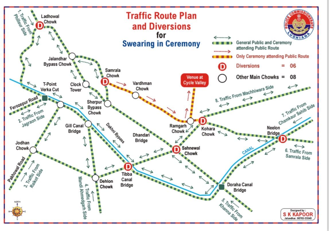 1. ਸਮਰਾਲਾ ਚੌਕ : ਸਮਰਾਲਾ ਚੌਕ ਤੋਂ ਚੰਡੀਗੜ੍ਹ ਵਾਲੇ ਪਾਸੇ ਜਾਦ ਵਾਲੇ ਵਾਹਨ ਸ਼ੇਰਪੁਰ ਚੌਕ ਤੋਂ ਹੋ ਕੇ ਦੋਰਾਹਾ ਅਤੇ ਫਿਰ ਨੀਲੋਂ ਵਾਲੇ ਪਾਸੇ ਤੋਂ ਚੰਡੀਗੜ੍ਹ ਵੱਲ ਜਾਣਗੇ।