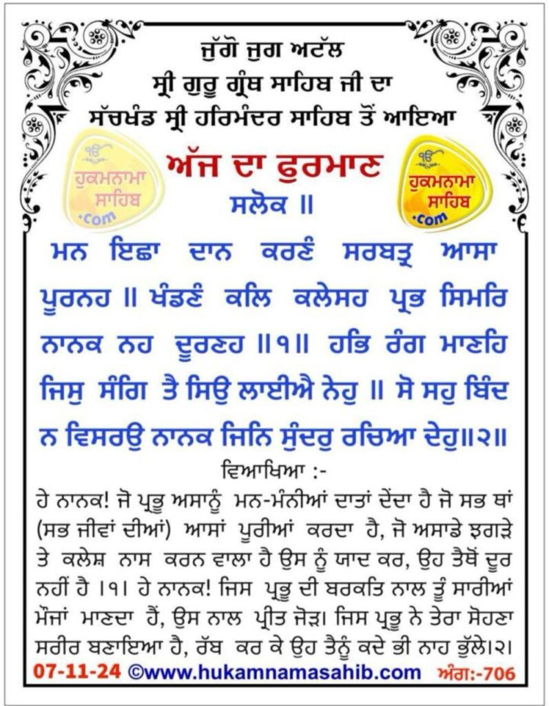 Thursday, 22nd Katak (Samvat 556 Nanakshahi) (Page: 706)