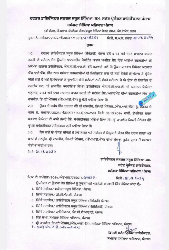 ਮਾਸਟਰ ਕਾਡਰ ਦੀ ਭਰਤੀ ਸਮੇਂ ਸਟੇਸ਼ਨ ਚੋਣ ਵਿੱਚ ਹੋਈਆਂ ਗੜਬੜੀਆਂ ਕਾਰਨ ਸਿੱਖਿਆ ਵਿਭਾਗ ਦੇ ਐਮਆਈਐਸ ਵਿੰਗ ਦੇ ਡਿਪਟੀ ਮੈਨੇਜਰ ਦੀਆਂ ਸੇਵਾਵਾਂ ਖਤਮ ਕੀਤੀਆਂ ਗਈਆਂ ਹਨ।
