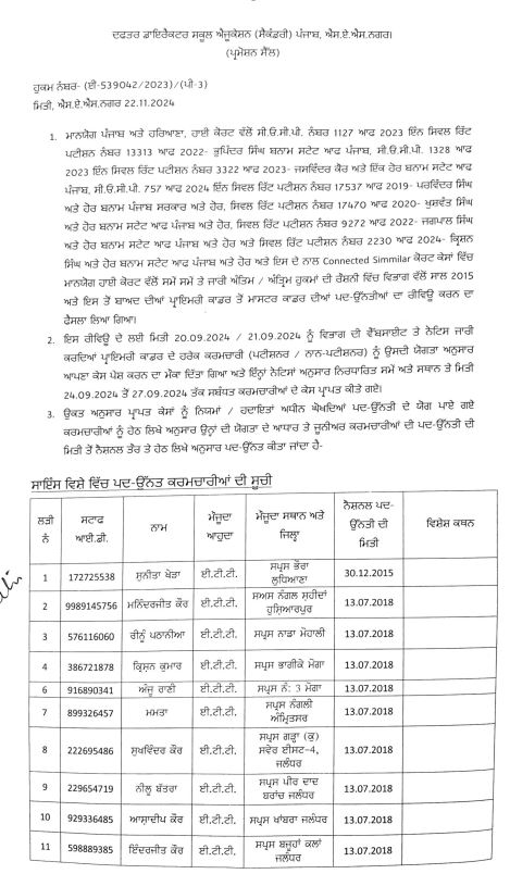 ਸਿੱਖਿਆ ਵਿਭਾਗ ਵੱਲੋਂ ਅਧਿਆਪਕਾਂ ਦੀਆਂ ਤਰੱਕੀਆਂ ਕੀਤੀਆਂ ਗਈਆਂ ਹਨ। ਸਿੱਖਿਆ ਵਿਭਾਗ ਵੱਲੋਂ ਪ੍ਰਾਇਮਰੀ ਕਾਡਰ ਤੋਂ ਮਾਸਟਰ ਕਾਡਰ ਦੀਆਂ ਪਦਉਨਤੀਆਂ ਕੀਤੀਆਂ ਗਈਆਂ ਹਨ।