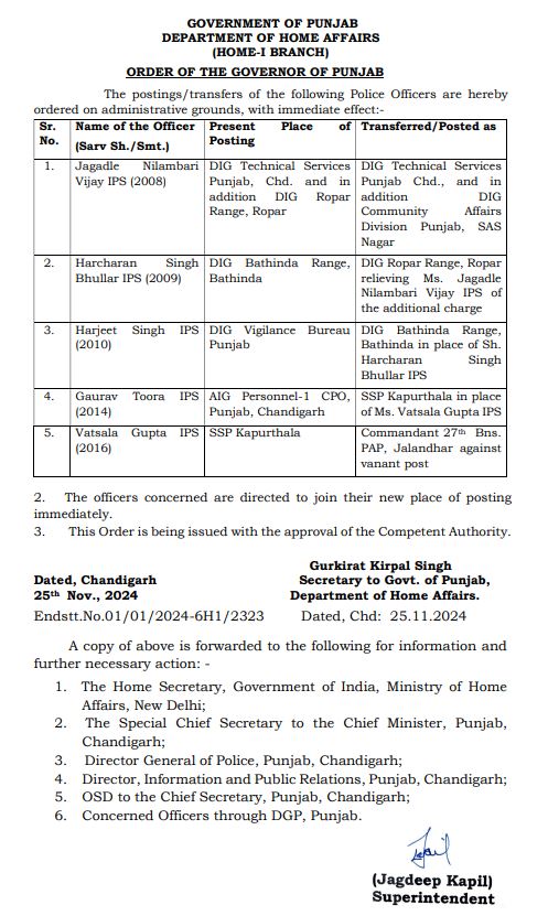 ਪੰਜਾਬ ਸਰਕਾਰ ਵੱਲੋਂ IPS ਅਧਿਕਾਰੀਆਂ ਦੀਆਂ ਬਦਲੀਆਂ ਪੰਜਾਬ ਨਵੰਬਰ 25, 2024ਨਵੰਬਰ 26, 2024Leave a Comment on ਪੰਜਾਬ ਸਰਕਾਰ ਵੱਲੋਂ IPS ਅਧਿਕਾਰੀਆਂ ਦੀਆਂ ਬਦਲੀਆਂ ਚੰਡੀਗੜ੍ਹ, 25 ਨਵੰਬਰ, ਦੇਸ਼ ਕਲਿੱਕ ਬਿਓਰੋ : ਪੰਜਾਬ ਸਰਕਾਰ ਵੱਲੋਂ 5 ਸੀਨੀਅਰ IPS ਅਧਿਕਾਰੀਆਂ ਦੀਆਂ ਬਦਲੀਆਂ ਕੀਤੀਆਂ ਗਈਆਂ ਹਨ।