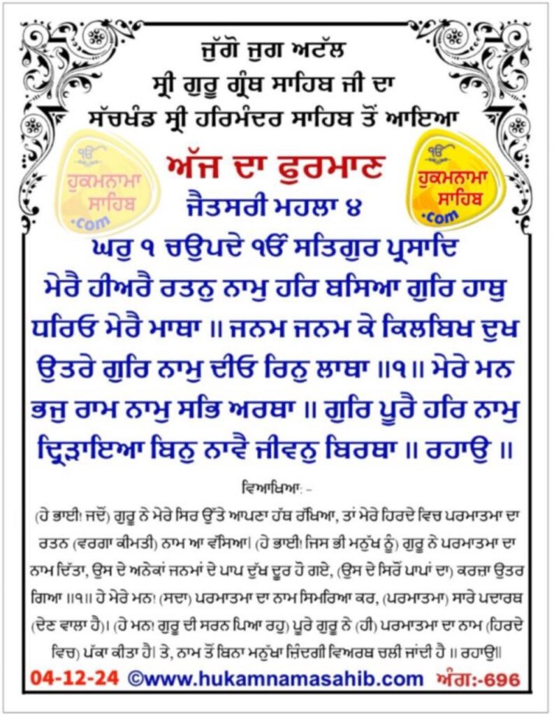 ਬੁੱਧਵਾਰ, ੧੯ ਮੱਘਰ (ਸੰਮਤ ੫੫੬ ਨਾਨਕਸ਼ਾਹੀ) 04-12-2024