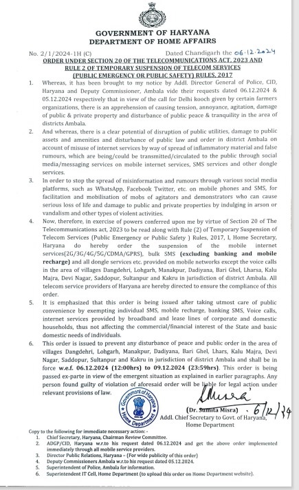 ਕਿਸਾਨਾਂ ਅੱਜ ਦਿੱਲੀ ਕੂਚ ਕਰਨ ਦੇ ਦਿੱਤੇ ਸੱਦੇ ਨੂੰ ਮੱਦੇਨਜ਼ਰ ਰੱਖਦੇ ਹੋਏ ਹਰਿਆਣਾ ਸਰਕਾਰ ਵੱਲੋਂ ਅੰਬਾਲਾ ਵਿੱਚ ਇੰਟਰਨੈਟ ਬੰਦ ਕਰ ਦਿੱਤਾ ਗਿਆ ਹੈ।