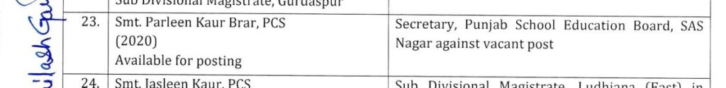 ਪੰਜਾਬ ਸਰਕਾਰ ਵੱਲੋਂ ਪੰਜਾਬ ਸਕੂਲ ਸਿੱਖਿਆ ਬੋਰਡ ਦੀ ਖਾਲੀ ਅਸਾਮੀ ਉਤੇ ਸਕੱਤਰ ਲਗਾ ਦਿੱਤਾ ਗਿਆ ਹੈ। ਪੰਜਾਬ ਸਰਕਾਰ ਵੱਲੋਂ ਅੱਜ ਆਈਏਐਸ ਅਤੇ ਆਈਪੀਐਸ ਅਧਿਕਾਰੀਆਂ ਦੀਆਂ ਬਦਲੀਆਂ ਕੀਤੀਆਂ ਗਈਆਂ। ਪੰਜਾਬ ਸਰਕਾਰ ਵੱਲੋਂ ਪਰਲੀਨ ਕੌਰ ਬਰਾੜ ਪੀਸੀਐਸ ਅਧਿਕਾਰੀ ਨੂੰ ਸਕੱਤਰ ਪੰਜਾਬ ਸਕੂਲ ਸਿੱਖਿਆ ਬੋਰਡ ਲਗਾਇਆ ਗਿਆ ਹੈ।