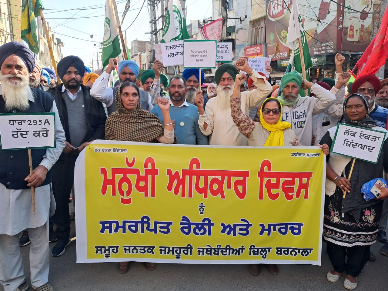 ਬਰਨਾਲਾ: ਜਮਹੂਰੀ ਜਥੇਬੰਦੀਆਂ ਵੱਲੋਂ ਮਨੁੱਖੀ ਅਧਿਕਾਰ ਦਿਵਸ ਨੂੰ ਸਮਰਪਿਤ ਜੋਸ਼ ਭਰਪੂਰ ਰੈਲੀ ਕਰਕੇ ਕੀਤਾ ਮਾਰਚ