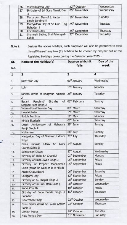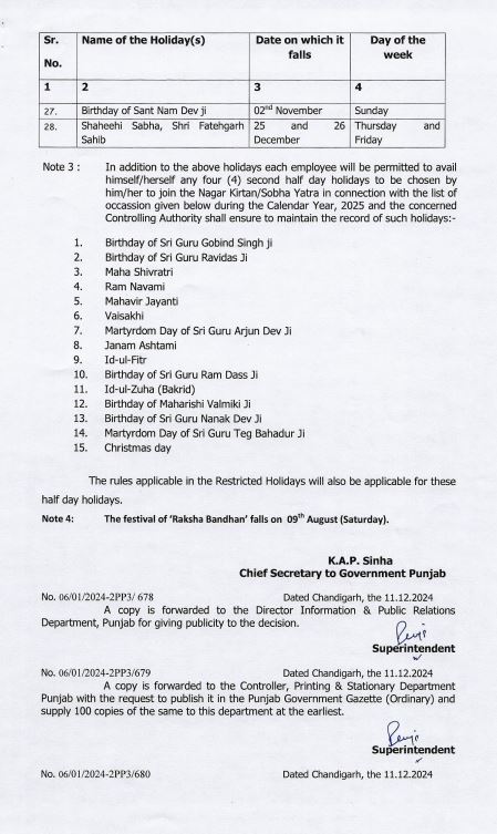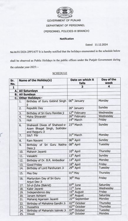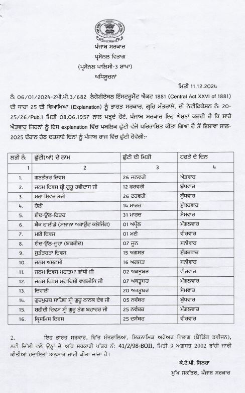 ਪੰਜਾਬ ਸਰਕਾਰ ਵੱਲੋਂ ਸਾਲ 2025 ਦੀਆਂ ਛੁੱਟੀਆਂ ਦੀ ਲਿਸਟ ਜਾਰੀ Punjab ਦਸੰਬਰ 11, 2024ਦਸੰਬਰ 11, 2024Leave a Comment on ਪੰਜਾਬ ਸਰਕਾਰ ਵੱਲੋਂ ਸਾਲ 2025 ਦੀਆਂ ਛੁੱਟੀਆਂ ਦੀ ਲਿਸਟ ਜਾਰੀ ਚੰਡੀਗੜ੍ਹ, 11 ਦਸੰਬਰ, ਦੇਸ਼ ਕਲਿੱਕ ਬਿਓਰੋ : ਪੰਜਾਬ ਸਰਕਾਰ ਵੱਲੋਂ ਸਾਲ 2025 ਦੀਆਂ ਛੁੱਟੀਆਂ ਦੀ ਲਿਸਟ ਜਾਰੀ ਕੀਤੀ ਗਈ ਹੈ।