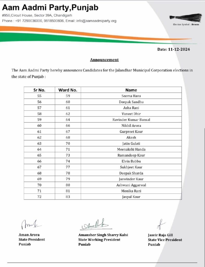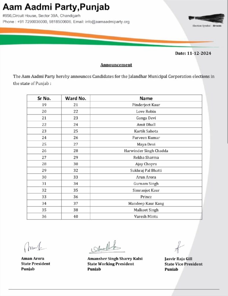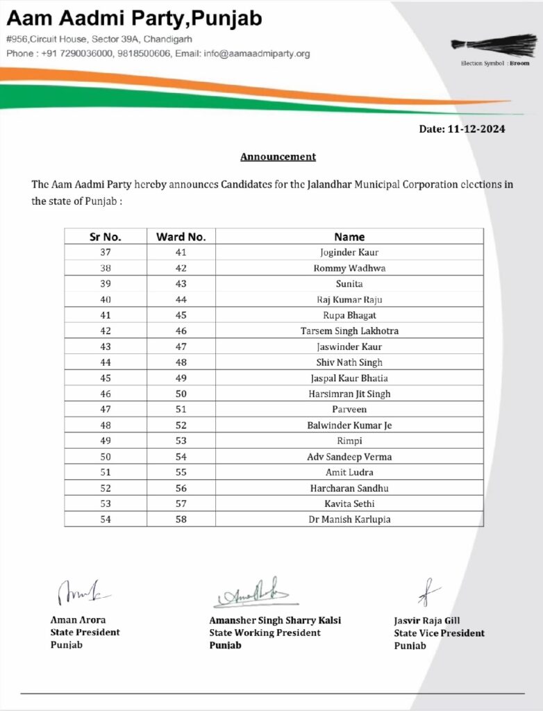 ਜਲੰਧਰ ਨਗਰ ਨਿਗਮ ਚੋਣਾਂ ਲਈ ਆਮ ਆਦਮੀ ਪਾਰਟੀ ਵੱਲੋਂ ਉਮੀਦਵਾਰਾਂ ਦੀ ਲਿਸਟ ਜਾਰੀ ਪੰਜਾਬ ਦਸੰਬਰ 11, 2024ਦਸੰਬਰ 11, 2024Leave a Comment on ਜਲੰਧਰ ਨਗਰ ਨਿਗਮ ਚੋਣਾਂ ਲਈ ਆਮ ਆਦਮੀ ਪਾਰਟੀ ਵੱਲੋਂ ਉਮੀਦਵਾਰਾਂ ਦੀ ਲਿਸਟ ਜਾਰੀ ਚੰਡੀਗੜ੍ਹ, 11 ਦਸੰਬਰ, ਦੇਸ਼ ਕਲਿੱਕ ਬਿਓਰੋ : ਆਮ ਆਦਮੀ ਪਾਰਟੀ ਵੱਲੋਂ ਜਲੰਧਰ ਨਗਰ ਨਿਗਮ ਚੋਣਾਂ ਲਈ ਉਮੀਦਵਾਰਾਂ ਦਾ ਐਲਾਨ ਕਰ ਦਿੱਤਾ ਗਿਆ ਹੈ।