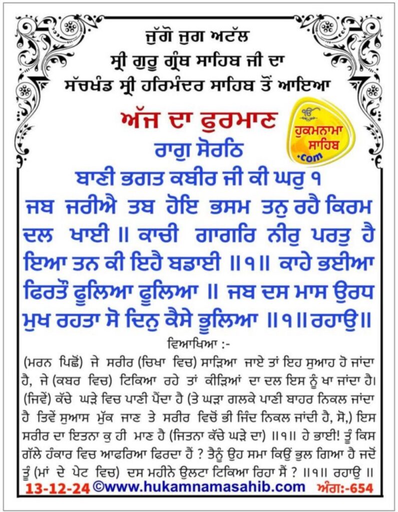 ਸ਼ੁੱਕਰਵਾਰ, ੨੮ ਮੱਘਰ (ਸੰਮਤ ੫੫੬ ਨਾਨਕਸ਼ਾਹੀ) 13-12-2024