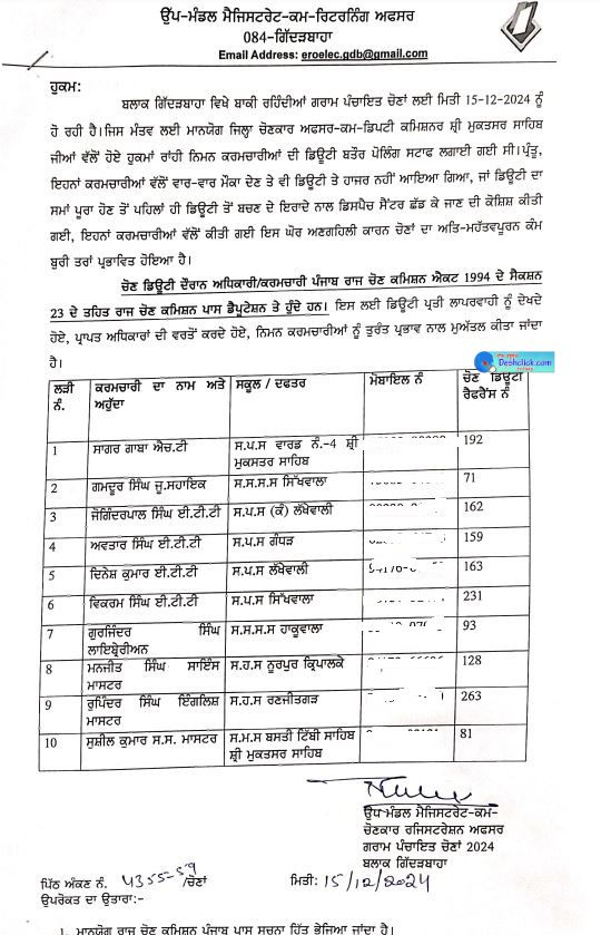 ਪੰਜਾਬ ਦੀਆਂ ਪੰਚਾਇਤੀ ਚੋਣਾਂ ਦੌਰਾਨ ਡਿਊਟੀ ’ਚ ਅਣਗਹਿਲੀ ਵਰਤਣ ਵਾਲੇ 10 ਅਧਿਆਪਕ ਮੁਅੱਤਲ ਪੰਜਾਬ ਦਸੰਬਰ 15, 2024ਦਸੰਬਰ 15, 2024Leave a Comment on ਪੰਜਾਬ ਦੀਆਂ ਪੰਚਾਇਤੀ ਚੋਣਾਂ ਦੌਰਾਨ ਡਿਊਟੀ ’ਚ ਅਣਗਹਿਲੀ ਵਰਤਣ ਵਾਲੇ 10 ਅਧਿਆਪਕ ਮੁਅੱਤਲ ਚੰਡੀਗੜ੍ਹ, 15 ਦਸੰਬਰ, ਦੇਸ਼ ਕਲਿੱਕ ਬਿਓਰੋ : ਪੰਚਾਇਤੀ ਚੋਣਾਂ ਦੌਰਾਨ ਅਗਣਗਹਿਲੀ ਵਰਤਣ ਵਾਲੇ 10 ਅਧਿਆਪਕਾਂ ਨੂੰ ਮੁਅੱਤਲ ਕੀਤਾ ਗਿਆ ਹੈ।