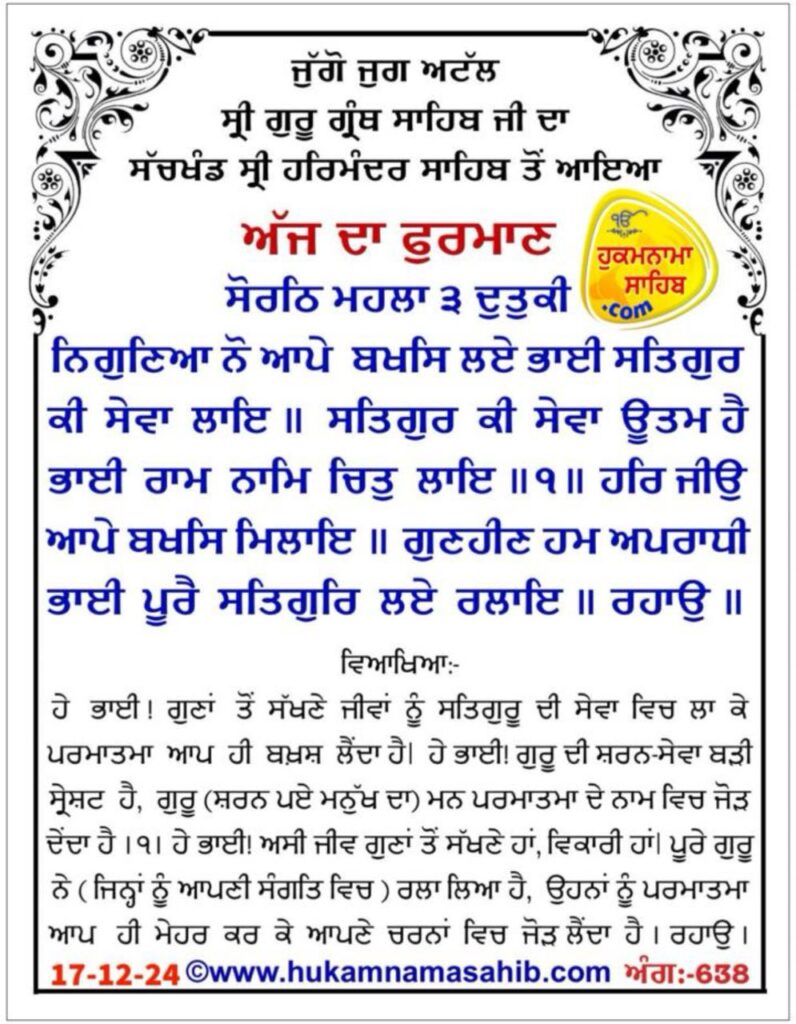ਅੰਮ੍ਰਿਤ ਵੇਲੇ ਦਾ ਹੁਕਮਨਾਮਾ ਸ੍ਰੀ ਹਰਿਮੰਦਰ ਸਾਹਿਬ ਅੰਮ੍ਰਿਤਸਰ