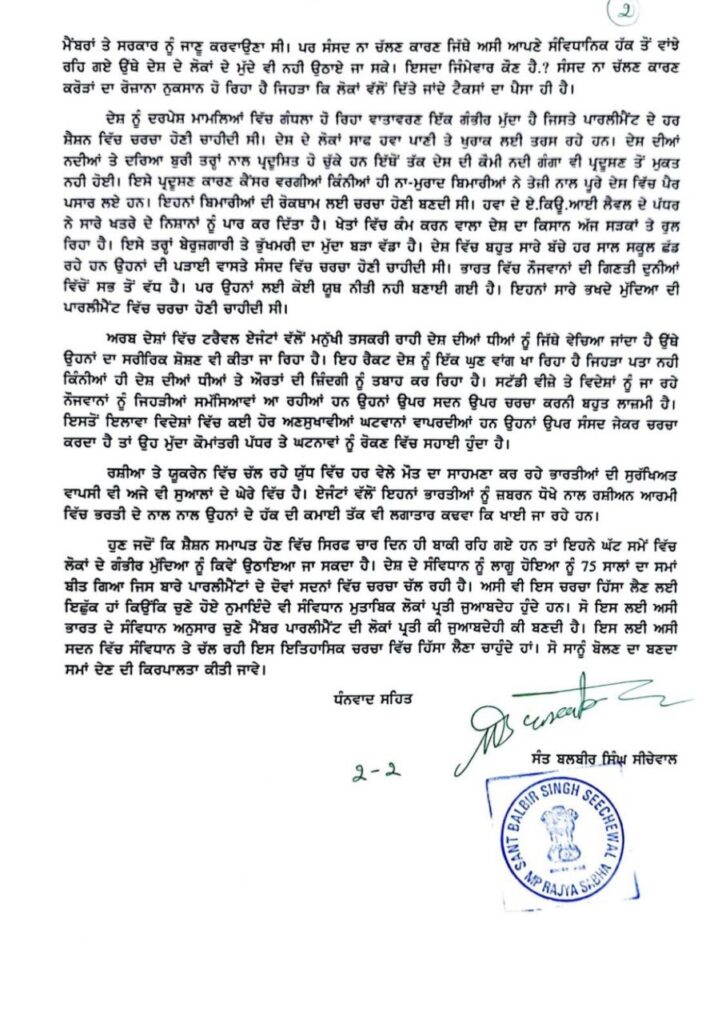 ਸੰਤ ਸੀਚੇਵਾਲ ਨੇ ਕਿਸਾਨੀ ਮਸਲਿਆਂ ‘ਤੇ ਚਰਚਾ ਲਈ ਜਗਦੀਪ ਧਨਖੜ ਤੋਂ ਮੰਗਿਆ ਸਮਾਂ Punjab ਦਸੰਬਰ 18, 2024ਦਸੰਬਰ 18, 2024Leave a Comment on ਸੰਤ ਸੀਚੇਵਾਲ ਨੇ ਕਿਸਾਨੀ ਮਸਲਿਆਂ ‘ਤੇ ਚਰਚਾ ਲਈ ਜਗਦੀਪ ਧਨਖੜ ਤੋਂ ਮੰਗਿਆ ਸਮਾਂ ਚੰਡੀਗੜ੍ਹ: 18 ਦਸੰਬਰ, ਦੇਸ਼ ਕਲਿੱਕ ਬਿਓਰੋਆਮ ਆਦਮੀ ਪਾਰਟੀ ਦੇ ਮੈਂਬਰ ਪਾਰਲੀਮੈਂਟ ਸੰਤ ਬਲਬੀਰ ਸਿੰਘ ਸੀਚੇਵਾਲ ਵੱਲੋਂ ਚੇਅਰਮੈਨ ਜਗਦੀਪ ਧਨਖੜ ਨੂੰ ਪੱਤਰ ਲਿਖਿਆ ਗਿਆ ਹੈ ਜਿਸ ਵਿੱਚ ਕਿਸਾਨੀ ਮਸਲਿਆਂ ‘ਤੇ ਚਰਚਾ ਕਰਨ ਲਈ ਸਮੇਂ ਦੀ ਮੰਗ ਕੀਤੀ ਗਈ ਹੈ।