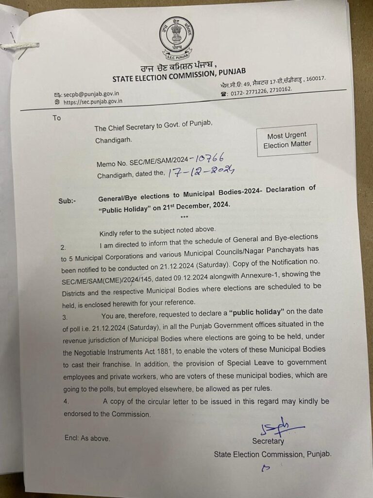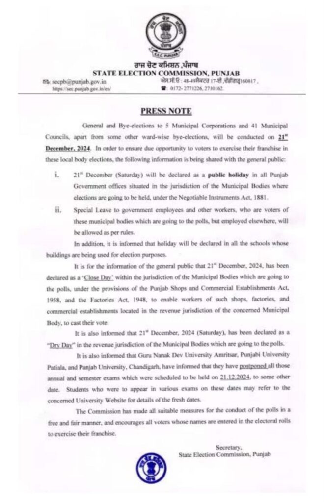 ਇਸ ਸਬੰਧੀ ਜਾਣਕਾਰੀ ਦਿੰਦਿਆਂ ਪੰਜਾਬ ਰਾਜ ਚੋਣ ਕਮਿਸ਼ਨ ਦੇ ਸਰਕਾਰੀ ਬੁਲਾਰੇ ਨੇ ਦੱਸਿਆ ਕਿ 21 ਦਸੰਬਰ (ਸ਼ਨੀਵਾਰ) ਨੂੰ ਨੈਗੋਸ਼ੀਏਬਲ ਇੰਸਟਰੂਮੈਂਟਸ ਐਕਟ, 1881 ਤਹਿਤ ਨਗਰ ਨਿਗਮਾਂ ਦੇ ਅਧਿਕਾਰ ਖੇਤਰ, ਜਿੱਥੇ ਚੋਣਾਂ ਹੋਣ ਜਾ ਰਹੀਆਂ ਹਨ, ਵਿੱਚ ਪੈਂਦੇ ਪੰਜਾਬ ਦੇ ਸਾਰੇ ਸਰਕਾਰੀ ਦਫ਼ਤਰਾਂ ਵਿੱਚ ਜਨਤਕ ਛੁੱਟੀ ਐਲਾਨੀ ਜਾਵੇਗੀ।