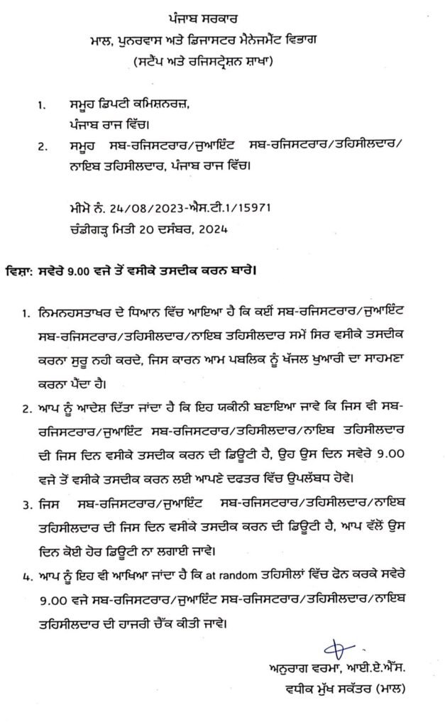ਸਬ ਰਜਿਸਟਰਾਰ, ਜੁਆਇੰਟ ਸਬ ਰਜਿਸਟਰਾਰ, ਤਹਿਸੀਲਦਾਰ, ਨਾਇਬ ਤਹਿਸਲਦਾਰ ਸਮੇਂ ਸਿਰ ਵਸੀਕੇ ਤਸਦੀਕ ਕਰਨਾ ਸ਼ੁਰੂ ਨਹੀਂ ਕਰਦੇ, ਇਸ ਨੂੰ ਲੈ ਕੇ ਹੁਣ ਸਰਕਾਰ ਨੇ ਸਖਤੀ ਕੀਤੀ ਹੈ। ਸਰਕਾਰ ਵੱਲੋਂ ਚੈਕਿੰਗ ਕਰਨ ਦੇ ਹੁਕਮ ਦਿੱਤੇ ਗਏ ਹਨ।