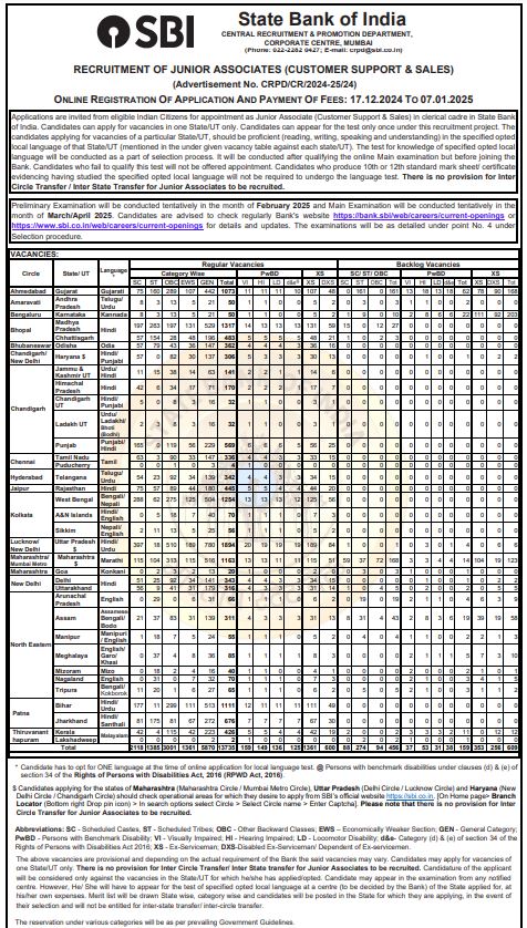 ਸਰਕਾਰੀ ਅਸਾਮੀਆਂ ਨਿਕਲਣ ਦੀ ਉਡੀਕ ਕਰ ਰਹੇ ਨੌਜਵਾਨਾਂ ਵਾਸਤੇ ਇਹ ਇਕ ਚੰਗੀ ਖਬਰ ਹੈ ਕਿ ਸਰਕਾਰੀ ਬੈਂਕ ਵਿੱਚ 13735 ਅਸਾਮੀਆਂ ਨਿਕਲੀਆਂ ਹਨ। ਸਟੇਟ ਬੈਂਕ ਆਫ ਇੰਡੀਆ ਵੱਲੋਂ 13735 ਅਸਾਮੀਆਂ ਲਈ ਅਰਜ਼ੀਆਂ ਮੰਗੀਆਂ ਗਈਆਂ ਹਨ। ਇਨ੍ਹਾਂ ਕੱਢੀਆਂ ਗਈਆਂ ਅਸਾਮੀਆਂ ਵਿਚੋਂ ਪੰਜਾਬ 569 ਅਤੇ ਚੰਡੀਗੜ੍ਹ ਲਈ 32 ਅਸਾਮੀਆਂ ਹਨ। ਯੋਗ ਉਮੀਦਵਾਰ 7 ਜਨਵਰੀ 2025 ਤੱਕ ਆਨਲਾਈਨ ਅਪਲਾਈ ਕਰ ਸਕਦੇ ਹਨ।