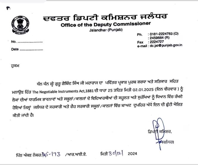 ਇਕ ਜ਼ਿਲ੍ਹੇ ਵਿੱਚ 2 ਜਨਵਰੀ ਦੀ ਅੱਧੇ ਦਿਨ ਦੀ ਛੁੱਟੀ Punjab ਦਸੰਬਰ 30, 2024ਦਸੰਬਰ 30, 2024Leave a Comment on ਇਕ ਜ਼ਿਲ੍ਹੇ ਵਿੱਚ 2 ਜਨਵਰੀ ਦੀ ਅੱਧੇ ਦਿਨ ਦੀ ਛੁੱਟੀ ਜਲੰਧਰ, 30 ਦਸੰਬਰ, ਦੇਸ਼ ਕਲਿੱਕ ਬਿਓਰੋ : ਜਲੰਧਰ ਜ਼ਿਲ੍ਹੇ ‘ਚ 2 ਜਨਵਰੀ 2025, ਵੀਰਵਾਰ ਨੂੰ ਅੱਧੇ ਦਿਨ ਦੀ ਛੁੱਟੀ (Half-day holiday) ਦਾ ਐਲਾਨ ਕੀਤਾ ਗਿਆ ਹੈ।