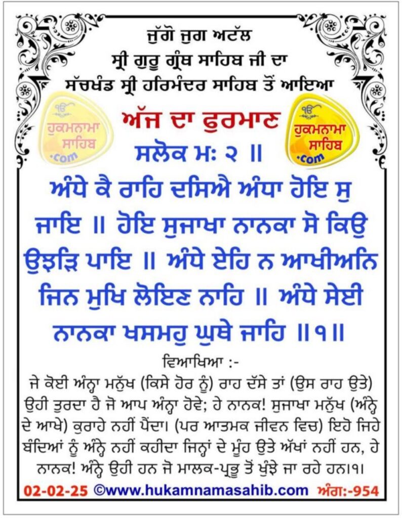 ਅੰਧੇ ਕੈ ਰਾਹਿ ਦਸਿਐ ਅੰਧਾ ਹੋਇ ਸੁ ਜਾਇ ॥ ਹੋਇ ਸੁਜਾਖਾ ਨਾਨਕਾ ਸੋ ਕਿਉ ਉਝੜਿ ਪਾਇ ॥ ਅੰਧੇ ਏਹਿ ਨ ਆਖੀਅਨਿ ਜਿਨ ਮੁਖਿ ਲੋਇਣ ਨਾਹਿ ॥ ਅੰਧੇ ਸੇਈ ਨਾਨਕਾ ਖਸਮਹੁ ਘੁਥੇ ਜਾਹਿ ॥੧॥ ਮਃ ੨ ॥ ਸਾਹਿਬਿ ਅੰਧਾ ਜੋ ਕੀਆ ਕਰੇ ਸੁਜਾਖਾ ਹੋਇ ॥ ਜੇਹਾ ਜਾਣੈ ਤੇਹੋ ਵਰਤੈ ਜੇ ਸਉ ਆਖੈ ਕੋਇ ॥ ਜਿਥੈ ਸੁ ਵਸਤੁ ਨ ਜਾਪਈ ਆਪੇ ਵਰਤਉ ਜਾਣਿ ॥ ਨਾਨਕ ਗਾਹਕੁ ਕਿਉ ਲਏ ਸਕੈ ਨ ਵਸਤੁ ਪਛਾਣਿ ॥੨॥ ਮਃ ੨ ॥ ਸੋ ਕਿਉ ਅੰਧਾ ਆਖੀਐ ਜਿ ਹੁਕਮਹੁ ਅੰਧਾ ਹੋਇ ॥ ਨਾਨਕ ਹੁਕਮੁ ਨ ਬੁਝਈ ਅੰਧਾ ਕਹੀਐ ਸੋਇ ॥੩॥ ਪਉੜੀ ॥ ਕਾਇਆ ਅੰਦਰਿ ਗੜੁ ਕੋਟੁ ਹੈ ਸਭਿ ਦਿਸੰਤਰ ਦੇਸਾ ॥ ਆਪੇ ਤਾੜੀ ਲਾਈਅਨੁ ਸਭ ਮਹਿ ਪਰਵੇਸਾ ॥ ਆਪੇ ਸ੍ਰਿਸਟਿ ਸਾਜੀਅਨੁ ਆਪਿ ਗੁਪਤੁ ਰਖੇਸਾ ॥ ਗੁਰ ਸੇਵਾ ਤੇ ਜਾਣਿਆ ਸਚੁ ਪਰਗਟੀਏਸਾ ॥ ਸਭੁ ਕਿਛੁ ਸਚੋ ਸਚੁ ਹੈ ਗੁਰਿ ਸੋਝੀ ਪਾਈ ॥੧੬॥
