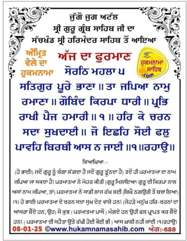 ਸਤਿਗੁਰ ਪੂਰੇ ਭਾਣਾ ॥ ਤਾ ਜਪਿਆ ਨਾਮੁ ਰਮਾਣਾ ॥ ਗੋਬਿੰਦ ਕਿਰਪਾ ਧਾਰੀ ॥ ਪ੍ਰਭਿ ਰਾਖੀ ਪੈਜ ਹਮਾਰੀ ॥੧॥ ਹਰਿ ਕੇ ਚਰਣ ਸਦਾ ਸੁਖਦਾਈ ॥ ਜੋ ਇਛਹਿ ਸੋਈ ਫਲੁ ਪਾਵਹ2ੱਚਖੰਡ ਸ੍ਰੀ ਹਰਿਮੰਦਰ ਸਾਹਿਬ ਸ੍ਰੀ ਅੰਮ੍ਰਿਤਸਰ