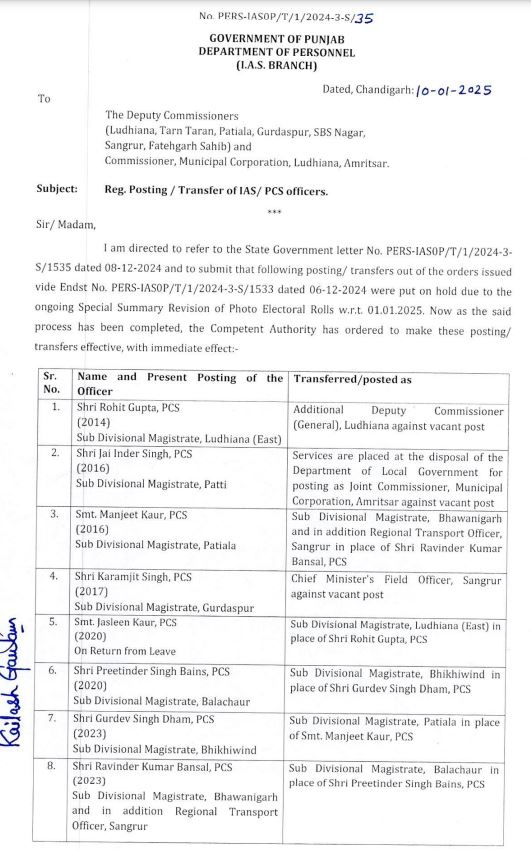 ਪੰਜਾਬ ਸਰਕਾਰ ਵੱਲੋਂ PCS ਅਧਿਕਾਰੀਆਂ ਦੀਆਂ ਬਦਲੀਆਂ ਪੰਜਾਬ ਜਨਵਰੀ 10, 2025ਜਨਵਰੀ 10, 2025Leave a Comment on ਪੰਜਾਬ ਸਰਕਾਰ ਵੱਲੋਂ PCS ਅਧਿਕਾਰੀਆਂ ਦੀਆਂ ਬਦਲੀਆਂ ਚੰਡੀਗੜ੍ਹ, 10 ਜਨਵਰੀ, ਦੇਸ਼ ਕਲਿੱਕ ਬਿਓਰੋ : ਪੰਜਾਬ ਸਰਕਾਰ ਵੱਲੋਂ ਪੀਸੀਐਸ ਅਧਿਕਾਰੀਆਂ ਦੀਆਂ ਬਦਲੀਆਂ ਕੀਤੀਆਂ ਗਈਆਂ ਹਨ।