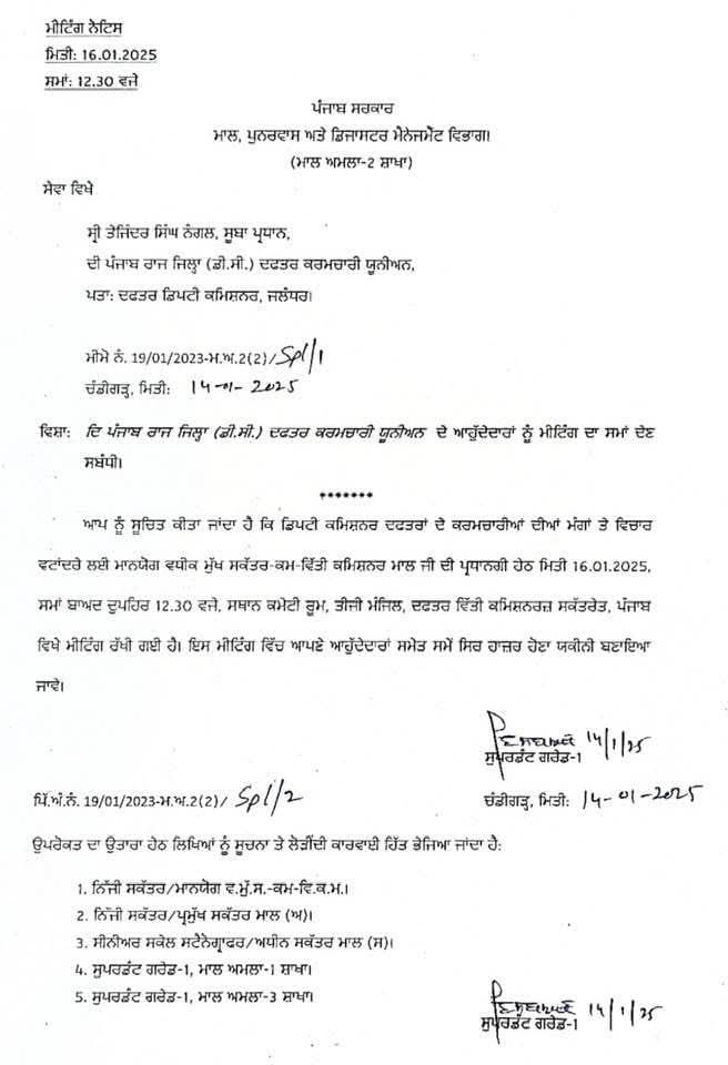 ਮੁਲਾਜ਼ਮਾਂ ਦੀਆਂ ਮੰਗਾਂ ਨੂੰ ਲੈ ਕ ਦਿ ਪੰਜਾਬ ਰਾਜ ਜ਼ਿਲ੍ਹਾ (ਡੀ ਸੀ) ਦਫ਼ਤਰ ਕਰਮਚਾਰੀ ਯੂਨੀਅਨ ਦੀ ਪੰਜਾਬ ਸਰਕਾਰ ਵੱਲੋਂ ਭਲਕੇ ਮੀਟਿੰਗ ਤੈਅ ਕੀਤੀ ਗਈ ਹੈ। ਭਲਕੇ 16 ਜਨਵਰੀ 2025 ਨੂੰ ਵਧੀਕ ਮੁੱਖ ਸਕੱਤਰ ਕਮ ਵਿੱਤੀ ਕਮਿਸ਼ਨਰ ਮਾਲ ਨਾਲ ਮੀਟਿੰਗ ਤੈਅ ਕੀਤੀ ਗਈ ਹੈ।