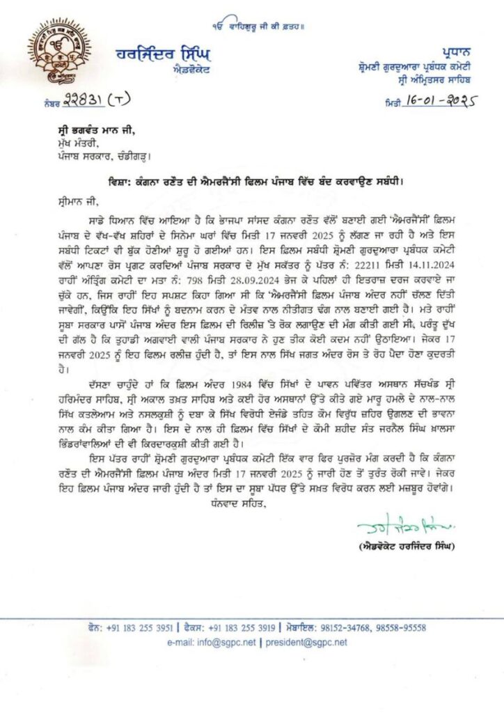 ਸ਼੍ਰੋਮਣੀ ਕਮੇਟੀ ਵੱਲੋਂ ਫਿਲਮ ‘ਐਮਰਜੈਂਸੀ‘ ‘ਤੇ ਰੋਕ ਲਾਉਣ ਬਾਰੇ ਮੁੱਖ ਮੰਤਰੀ ਭਗਵੰਤ ਮਾਨ ਨੂੰ ਪੱਤਰ