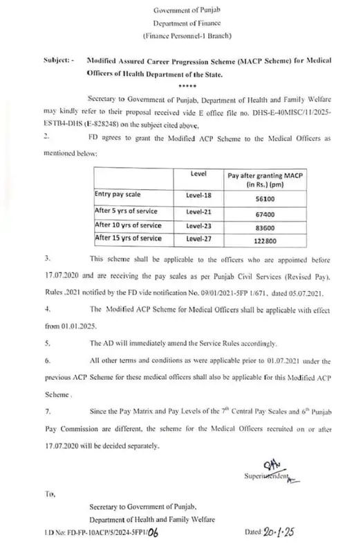 ਪੰਜਾਬ ਸਰਕਾਰ ਵੱਲੋਂ ਸਰਕਾਰੀ ਹਸਪਤਾਲਾਂ ਦੇ ਡਾਕਟਰਾਂ ਨੂੰ ਵੱਡੀ ਰਾਹਤ ਦਿੱਤੀ ਹੈ। ਪੰਜਾਬ ਸਰਕਾਰ ਨੇ ਪਿਛਲੇ ਸਮੇਂ ਤੋਂ ਬੰਦ ਪਈ ਪ੍ਰਮੋਸ਼ਨਲ ਪੇਅ ਸਕੀਮ ਨੂੰ ਮੁੜ ਤੋਂ ਬਹਾਲ ਕਰ ਦਿੱਤਾ ਹੈ। ਇਸ ਸਕੀਮ ਨੂੰ ਬਹਾਲ ਕਰਨ ਲਈ ਸਰਕਾਰ ਤੇ ਡਾਕਟਰਾਂ ਵਿੱਚਕਾਰ ਪਿਛਲੇ ਸਮੇਂ ਤੋਂ ਗੱਲਬਾਤ ਚੱਲਦੀ ਸੀ, ਜਿਸ ਨੂੰ ਅੱਜ ਬੂਰ ਪੈ ਗਿਆ ਹੈ। ਪੰਜਾਬ ਸਰਕਾਰ ਵੱਲੋਂ ਜਾਰੀ ਪੱਤਰ ਵਿੱਚ ਇਹ ਵੀ ਕਿਹਾ ਗਿਆ ਹੈ ਕਿ ਇਹ ਉਨ੍ਹਾਂ ਅਧਿਕਾਰੀਆਂ ਉਤੇ ਲਾਗੂ ਹੋਵੇਗੀ ਜੋ 17 ਜੁਲਾਈ 2020 ਤੋਂ ਪਹਿਲਾਂ ਨਿਯੁਕਤ ਹੋਏ ਹਨ ਅਤੇ 5 ਜੁਲਾਈ 2021 ਦੇ ਮੁਤਾਬਕ ਐਫਡੀ ਦਰਾਂ ਅਧਿਸੂਚਿਤ ਪੰਜਾਬ ਸਿਵਿਲ ਸੇਵਾ (ਸੰਸ਼ੋਧਿਤ ਵੇਤਨ) 2021 ਅਨੁਸਾਰ ਤਨਾ ਮਿਲ ਰਿਹਾ ਹੈ।