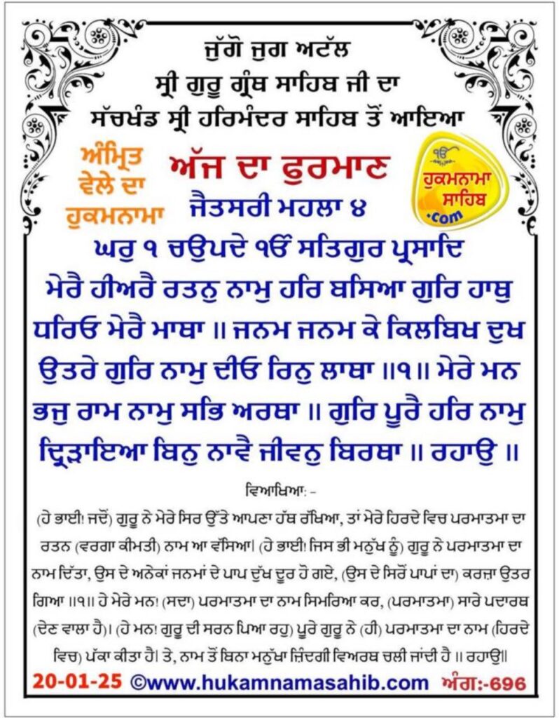 The Jewel of the Lord’s Name abides within my heart; the Guru has placed His hand on my forehead. The sins and pains of countless incarnations have been cast out. The Guru has blessed me with the Naam, the Name of the Lord, and my debt has been paid off. 1 O my mind, vibrate the Lord’s Name, and all your affairs shall be resolved. The Perfect Guru has implanted the Lord’s Name within me; without the Name, life is useless. Pause Without the Guru, the self-willed manmukhs are foolish and ignorant; they are forever entangled in emotional attachment to Maya. They never serve the feet of the Holy; their lives are totally useless. 2 Those who serve at the feet of the Holy, the feet of the Holy, their lives are made fruitful, and they belong to the Lord. Make me the slave of the slave of the slaves of the Lord; bless me with Your Mercy, O Lord of the Universe. 3 I am blind, ignorant and totally without wisdom; how can I walk on the Path? I am blind — O Guru, please let me grasp the hem of Your robe, so that servant Nanak may walk in harmony with You. 4 1 ||