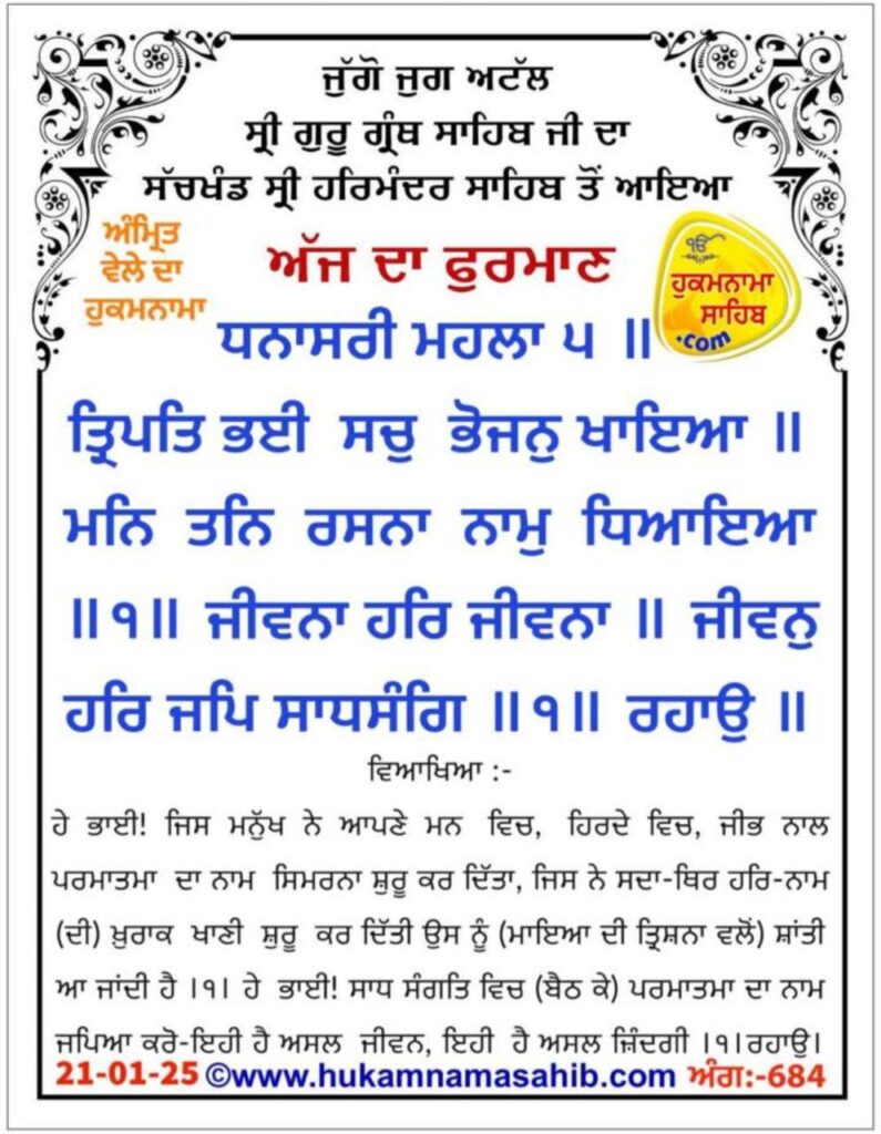 I am satisfied and satiated, eating the food of Truth. With my mind, body and tongue, I meditate on the Naam, the Name of the Lord. 1 Life, spiritual life, is in the Lord. Spiritual life consists of chanting the Lord’s Name in the Saadh Sangat, the Company of the Holy. 1 Pause