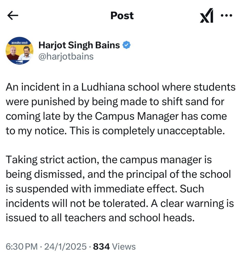 ਸ. ਹਰਜੋਤ ਸਿੰਘ ਬੈਂਸ ਨੇ ਕਿਹਾ ਕਿ ਸਰਕਾਰੀ ਸੀਨੀਅਰ ਸੈਕੰਡਰੀ ਸਕੂਲ ਜਵਾਹਰ ਨਗਰ, ਸਕੂਲ ਆਫ਼ ਐਮੀਨੈਂਸ (ਲੜਕੇ), ਲੁਧਿਆਣਾ ਦੇ ਪ੍ਰਿੰਸੀਪਲ ਅਤੇ ਕੈਂਪਸ ਮੈਨੇਜਰ ਨੇ ਸਕੂਲ ਵਿਚ ਦੇਰ ਨਾਲ ਆਉਣ ਵਾਲੇ ਵਿਦਿਆਰਥੀਆਂ ਤੋਂ ਸਜ਼ਾ ਵਜੋਂ ਰੇਤਾ ਅਤੇ ਬੱਜਰੀ ਚੁਕਵਾਈ ਗਈ ਸੀ। ਇਸ ਲਈ ਸਕੂਲ ਦੇ ਪ੍ਰਿੰਸੀਪਲ ਨੂੰ ਤਾਂ ਮੁਅੱਤਲ ਕਰ ਦਿੱਤਾ ਗਿਆ ਹੈ ਅਤੇ ਕੈਂਪਸ ਮੈਨੇਜਰ ਨੂੰ ਬਰਖਾਸਤ ਕਰ ਦਿੱਤਾ ਗਿਆ ਹੈ।