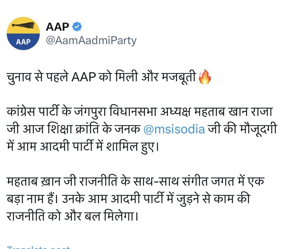 ਦਿੱਲੀ ਵਿਧਾਨ ਸਭਾ ਚੋਣਾਂ ਤੌਂ ਐਨ ਪਹਿਲਾਂ ਕਾਂਗਰਸ ਪਾਰਟੀ ਨੂੰ ਉਸ ਸਮੇਂ ਇੱਕ ਵੱਡਾ ਝਟਕਾ ਲੱਗਿਆ ਜਦੋਂ ਜੰਗਪੁਰਾ ਵਿਧਾਨ ਸਭਾ ਹਲਕੇ ਤੋਂ ਕਾਂਗਰਸ ਦੇ ਉਮੀਦਵਾਰ ਮਹਿਤਾਬ ਖਾਨ ਆਮ ਆਦਮੀ ਪਾਰਟੀ ਵਿੱਚ ਸ਼ਾਮਲ ਹੋ ਗਏ ਹਨ। ਉਨ੍ਹਾਂ ਨੂੰ ਦਿੱਲੀ ਦੇ ਸਾਬਕਾ ਸਿੱਖਿਆ ਮੰਤਰੀ ਮਨੀਸ਼ ਸਿਸੋਦੀਆ ਨੇ ਸ਼ਾਮਲ ਕਰਵਾਇਆ।