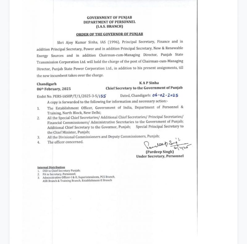 ਪੰਜਾਬ ਸਰਕਾਰ ਨੇ 1996 ਬੈਚ ਦੇ ਸੀਨੀਅਰ ਆਈ. ਏ. ਐੱਸ ਅਧਿਕਾਰੀ ਸਕੱਤਰ ਊਰਜਾ ਅਜੋਏ ਕੁਮਾਰ ਸਿਨਹਾ ਨੂੰ ਸੀ. ਐੱਮ. ਡੀ. ਪਾਵਰਕਾਮ ਦਾ ਐਡੀਸ਼ਨਲ ਚਾਰਜ ਦੇ ਦਿੱਤਾ ਹੈ।