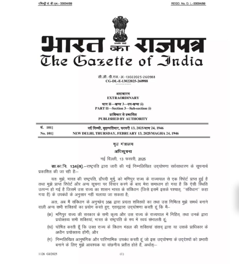 ਮਨੀਪੁਰ ਵਿਚ ਰਾਸ਼ਟਰਪਤੀ ਸ਼ਾਸਨ ਲਾਗੂ ਹੋ ਗਿਆ ਹੈ। ਜ਼ਿਕਰਯੋਗ ਹੈ ਕਿ ਮਨੀਪੁਰ ਦੇ ਮੁੱਖ ਮੰਤਰੀ ਐਨ. ਬੀਰੇਨ ਸਿੰਘ ਨੇ 9 ਫਰਵਰੀ ਨੂੰ ਆਪਣੇ ਅਹੁਦੇ ਤੋਂ ਅਸਤੀਫਾ ਦੇ ਦਿੱਤਾ ਸੀ। ਉਨ੍ਹਾਂ ਨੇ ਐਤਵਾਰ ਨੂੰ ਦਿੱਲੀ ‘ਚ ਕੇਂਦਰੀ ਲੀਡਰਸ਼ਿਪ ਨਾਲ ਮੁਲਾਕਾਤ ਤੋਂ ਬਾਅਦ ਰਾਜਪਾਲ ਨੂੰ ਆਪਣਾ ਅਸਤੀਫਾ ਸੌਂਪ ਦਿੱਤਾ।ਰਾਜ ਵਿੱਚ 1951 ਤੋਂ ਬਾਅਦ ਇਹ 11ਵੀਂ ਵਾਰ ਰਾਸ਼ਟਰਪਤੀ ਸ਼ਾਸਨ ਦਾ ਐਲਾਨ ਕੀਤਾ ਗਿਆ ਹੈ।ਰਾਸ਼ਟਰਪਤੀ ਦ੍ਰੋਪਦੀ ਮੁਰਮੂ ਦੇ ਦਫਤਰ ਤੋਂ ਇਕ ਬਿਆਨ ਵਿਚ ਕਿਹਾ ਗਿਆ ਹੈ ਕਿ ਰਾਜਪਾਲ ਅਜੈ ਭੱਲਾ ਤੋਂ ਰਿਪੋਰਟ ਪ੍ਰਾਪਤ ਕਰਨ ਅਤੇ ਮੇਰੇ ਦੁਆਰਾ ਪ੍ਰਾਪਤ ਰਿਪੋਰਟ ਅਤੇ ਹੋਰ ਸੂਚਨਾਵਾਂ ‘ਤੇ ਵਿਚਾਰ ਕਰਨ ਤੋਂ ਬਾਅਦ, ਮੈਂ ਸੰਤੁਸ਼ਟ ਹਾਂ ਕਿ ਅਜਿਹੀ ਸਥਿਤੀ ਪੈਦਾ ਹੋ ਗਈ ਹੈ ਜਿਸ ਵਿਚ ਉਸ ਰਾਜ ਦੀ ਸਰਕਾਰ ਨੂੰ ਭਾਰਤ ਦੇ ਸੰਵਿਧਾਨ ਦੇ ਉਪਬੰਧਾਂ ਅਨੁਸਾਰ ਨਹੀਂ ਚਲਾਇਆ ਜਾ ਸਕਦਾ ਹੈ।