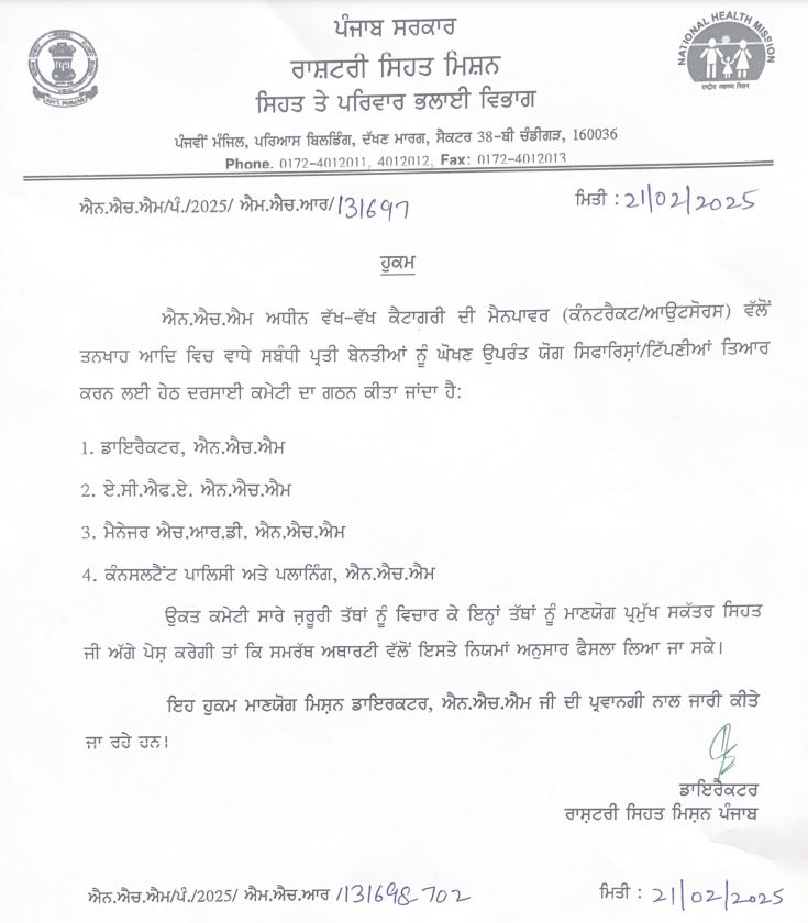 NHM ਅਧੀਨ ਕੰਮ ਕਰਦੇ ਕਰਮਚਾਰੀਆਂ ਦੀਆਂ ਤਨਖਾਹ ਵਧਾਉਣ ਸਬੰਧੀ ਕਮੇਟੀ ਦਾ ਗਠਨ ਪੰਜਾਬ ਫਰਵਰੀ 21, 2025ਫਰਵਰੀ 21, 2025Leave a Comment on NHM ਅਧੀਨ ਕੰਮ ਕਰਦੇ ਕਰਮਚਾਰੀਆਂ ਦੀਆਂ ਤਨਖਾਹ ਵਧਾਉਣ ਸਬੰਧੀ ਕਮੇਟੀ ਦਾ ਗਠਨ ਚੰਡੀਗੜ੍ਹ, 21 ਫਰਵਰੀ, ਦੇਸ਼ ਕਲਿੱਕ ਬਿਓਰੋ : ਪੰਜਾਬ ਸਰਕਾਰ ਵੱਲੋਂ ਐਨਐਚਐਮ ਅਧੀਨ ਕੈਨਟਰੈਕਟ/ਆਊਟਸੋਰਸ ਉਤੇ ਕੰਮ ਕਰਦੇ ਕਰਮਚਾਰੀਆਂ ਦੀਆਂ ਤਨਖਾਹ ਵਿੱਚ ਵਾਧੇ ਸਬੰਧੀ 4 ਮੈਂਬਰੀ ਕਮੇਟੀ ਦਾ ਗਠਨ ਕੀਤਾ ਗਿਆ ਹੈ।