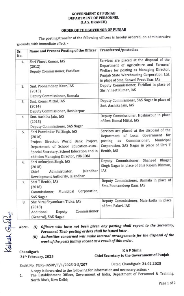 ਪੰਜਾਬ ਸਰਕਾਰ ਵੱਲੋਂ 5 ਜ਼ਿਲ੍ਹਿਆਂ ਦੇ ਡਿਪਟੀ ਕਮਿਸ਼ਨਰਾਂ ਸਮੇਤ 8 IAS ਅਧਿਕਾਰੀਆਂ ਦੇ ਤਬਾਦਲੇ ਕੀਤੇ ਗਏ ਹਨ। ਮੋਹਾਲੀ ਜ਼ਿਲ੍ਹੇ ਦੇ ਡੀ ਸੀ ਅਤੇ ਨਗਰ ਨਿਗਮ ਦੇ ਕਮਿਸ਼ਨਰ ਵੀ ਬਦਲ ਦਿੱਤੇ ਗਏ ਹਨ। ਕੋਮਲ ਮਿੱਤਲ ਨੂੰ ਮੋਹਾਲੀ ਦੇ ਨਵੇਂ ਡਿਪਟੀ ਕਮਿਸ਼ਨਰ ਨਿਯੁਕਤ ਕੀਤਾ ਗਿਆ ਹੈ।