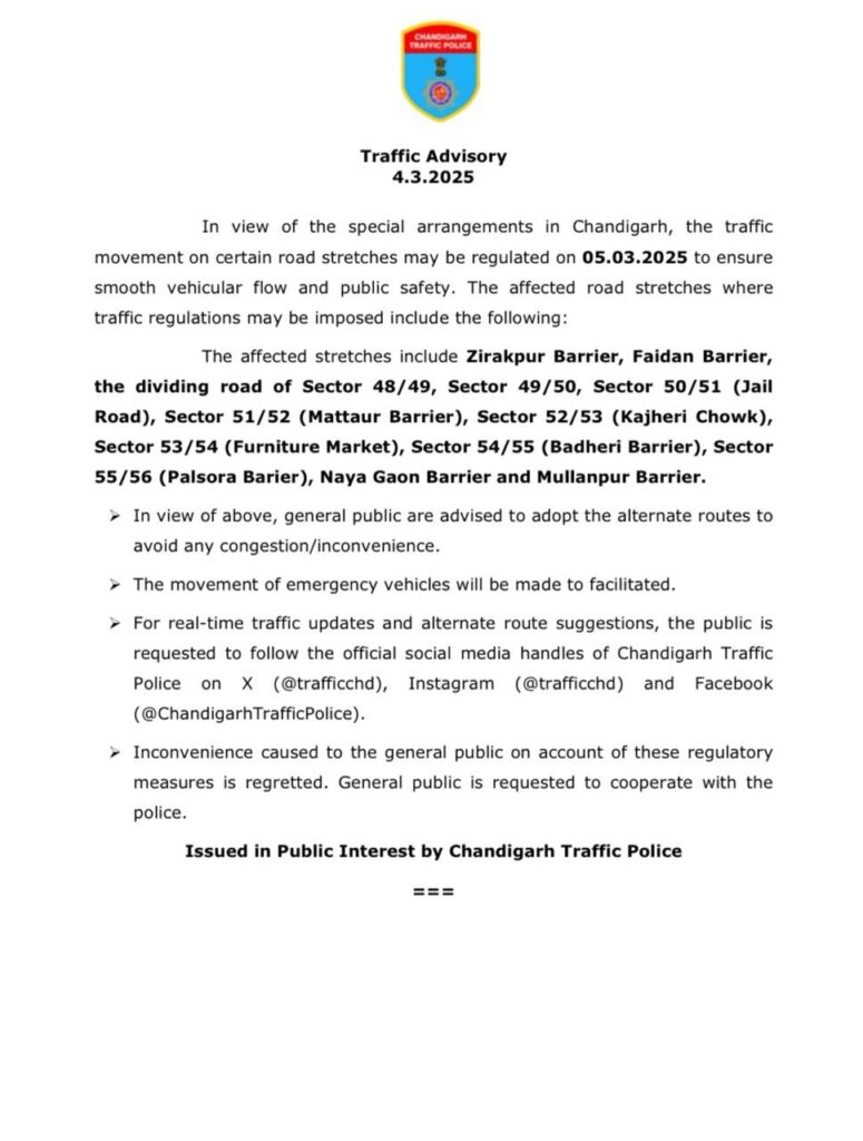 ਕਿਸਾਨਾਂ ਵੱਲੋਂ ਭਲਕੇ ਚੰਡੀਗੜ੍ਹ ਵਿੱਚ ਲਗਾਏ ਜਾਣ ਵਾਲੇ ਪੱਕੇ ਮੋਰਚੇ ਦੇ ਮੱਦੇਨਜ਼ਰ ਚੰਡੀਗੜ੍ਹ ਪ੍ਰਸ਼ਾਸਨ ਵੱਲੋਂ ਤਿਆਰੀ ਖਿੱਚੀ ਗਈ ਹੈ। ਚੰਡੀਗੜ੍ਹ ਪ੍ਰਸ਼ਾਸਨ ਵੱਲੋਂ ਕਿਸਾਨਾਂ ਨੂੰ ਪੰਜਾਬ ਦੀ ਸਰਹੱਦ ਉਤੇ ਹੀ ਰੋਕਣ ਦੀ ਤਿਆਰੀ ਕੀਤੀ ਜਾ ਰਹੀ ਹੈ। ਚੰਡੀਗੜ੍ਹ ਪੁਲਿਸ ਵੱਲੋਂ ਟ੍ਰੈਫਿਕ ਐਡਵਾਈਜ਼ਰੀ ਜਾਰੀ ਕੀਤੀ ਗਈ ਹੈ। ਜਾਰੀ ਅਡਵਾਈਜ਼ਰੀ ਮੁਤਾਬਕ ਜ਼ੀਰਕਪੁਰ ਬੈਰੀਅਰ, ਫੈਦਾਨ ਬੈਰੀਅਰ, ਸੈਕਟਰ ਵੰਡਣ ਵਾਲੀਆਂ ਸੜਕਾਂ: 48/49, 49/50, 50/51 (ਜੇਲ ਰੋਡ), 51/52 (ਮਟੌਰ ਬੈਰੀਅਰ), 52/53 (ਕਜਹੇੜੀ ਚੌਕ), 53/54 (ਫਰਨੀਚਰ ਮਾਰਕੀਟ), 54/55 (ਬਡਹੇੜੀ ਬੈਰੀਅਰ), 55/56 ਪੀ., ਨਵਾਂ ਗਾਓਂ ਬੈਰੀਅਰ ਅਤੇ ਮੁੱਲਾਂਪੁਰ ਬੈਰੀਅਰ ਪ੍ਰਭਾਵਤ ਕੀਤਾ ਗਿਆ ਹੈ।