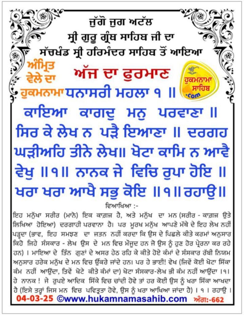 The body is the paper, and the mind is the inscription written upon it. The ignorant fool does not read what is written on his forehead. In the Court of the Lord, three inscriptions are recorded. Behold, the counterfeit coin is worthless there. 1 O Nanak, if there is silver in it, then everyone proclaims, “It is genuine, it is genuine.” 1 Pause