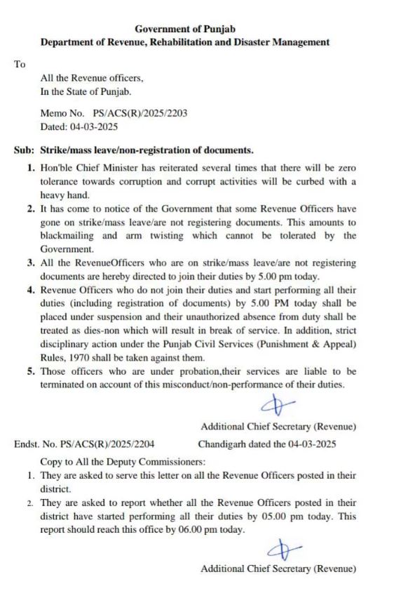 ਸਮੂਹਿਕ ਛੁੱਟੀ ਉਤੇ ਗਏ ਹੋਏ ਮਾਲ ਅਧਿਕਾਰੀਆਂ ਨੂੰ ਸਰਕਾਰ ਵੱਲੋਂ ਸਖਤ ਚਿਤਾਵਨੀ ਦਿੱਤੀ ਗਈ ਹੈ ਕਿ ਜੇਕਰ 5 ਵਜੇ ਤੱਕ ਡਿਊਟੀ ਉਤੇ ਹਾਜ਼ਰ ਨਾ ਹੋਏ ਤਾਂ ਸਾਰਿਆਂ ਨੂੰ ਮੁਅੱਤਲ ਕਰ ਦਿੱਤਾ ਜਾਵੇਗਾ। ਇਸ ਸਬੰਧੀ ਪੰਜਾਬ ਸਰਕਾਰ ਇਕ ਪੱਤਰ ਜਾਰੀ ਕੀਤਾ ਗਿਆ ਹੈ। ਪੰਜਾਬ ਸਰਕਾਰ ਨੇ ਮਾਲ ਅਧਿਕਾਰੀਆਂ ਨੂੰ ਸ਼ਾਮ 5 ਵਜੇ ਤੱਕ ਹੜਤਾਲ ਖਤਮ ਕਰਨ ਅਤੇ ਡਿਊਟੀ ਜੁਆਇਨ ਕਰਨ ਦੀ ਚਿਤਾਵਨੀ ਦਿੱਤੀ ਹੈ। ਜੇਕਰ ਅਜਿਹਾ ਨਾ ਕੀਤਾ ਤਾਂ ਸ਼ਾਮ 5 ਵਜੇ ਤੋਂ ਬਾਅਦ ਸਾਰਿਆਂ ਨੂੰ ਸਸਪੈਂਡ ਕੀਤਾ ਜਾ ਸਕਦਾ ਹੈ।