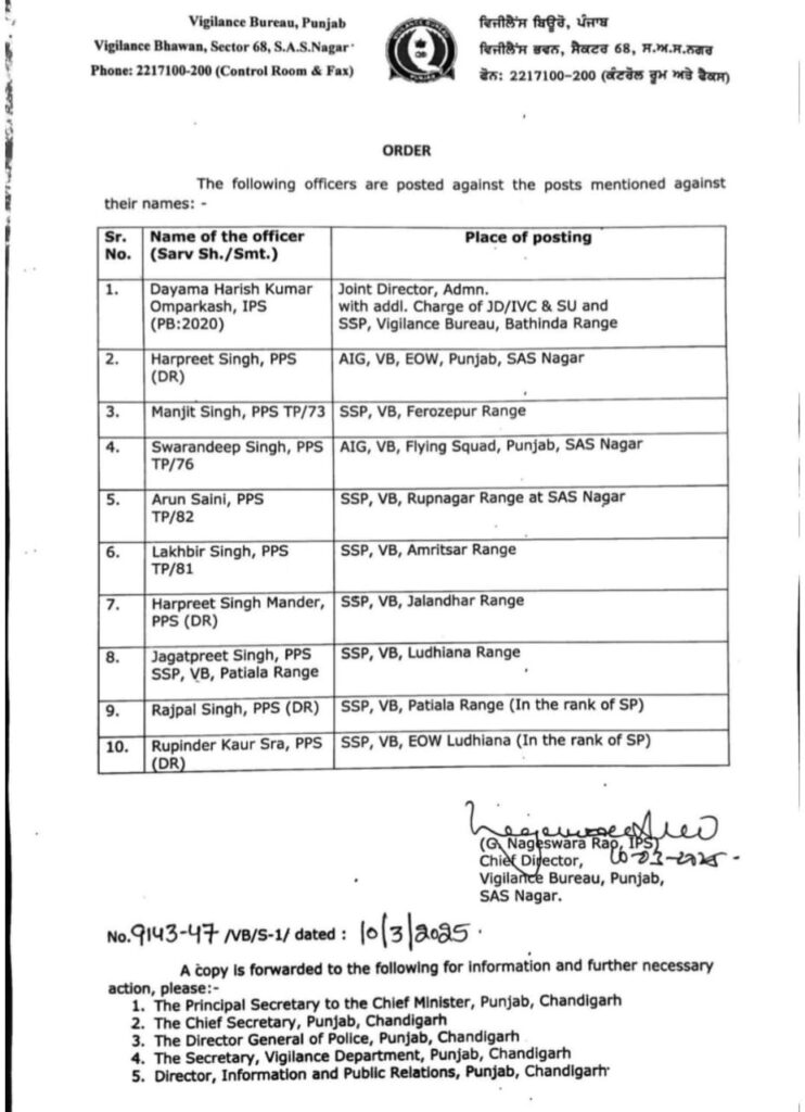 ਵਿਜੀਲੈਂਸ ਬਿਓਰੋ ਪੰਜਾਬ ਵੱਲੋਂ ਐਸ ਐਸ ੀਜ਼ ਦੀਆਂ ਬਦਲੀਆਂ ਕੀਤੀਆਂ ਗਈਆਂ ਹਨ।