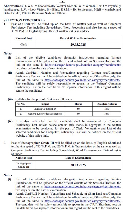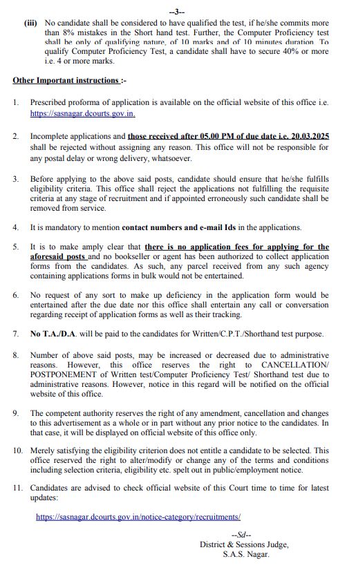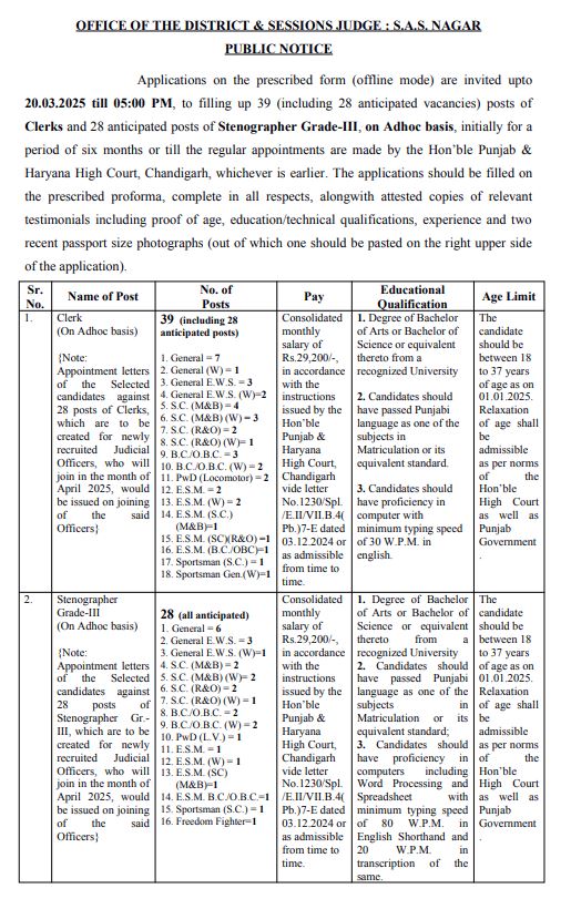 ਸਰਕਾਰੀ ਨੌਕਰੀਆਂ ਦੀ ਉਡੀਕ ਕਰ ਰਹੇ ਨੌਜਵਾਨਾਂ ਲਈ ਇਹ ਚੰਗੀ ਖਬਰ ਹੈ ਕਿ ਮੋਹਾਲੀ ਜ਼ਿਲ੍ਹੇ ਵਿੱਚ ਕਲਰਕਾਂ ਤੇ ਸਟੈਨੋਗ੍ਰਾਫਰ ਦੀਆਂ ਅਸਾਮੀਆਂ ਨਿਕਲੀਆਂ ਹਨ। ਐਸਏਐਸ ਨਗਰ ਜ਼ਿਲ੍ਹਾ ਅਦਾਲਤ ਵਿੱਚ ਕਲਰਕਾਂ ਤੇ ਸਟੈਨੋਗ੍ਰਾਫਰ ਦੀਆਂ ਅਸਾਮੀਆਂ ਨਿਕਲੀਆਂ ਹਨ। ਯੋਗ ਉਮੀਦਵਾਰ 20 ਮਾਰਚ 2025 ਤੱਕ ਇਨ੍ਹਾਂ ਅਸਾਮੀਆਂ ਲਈ ਫਾਰਮ ਭਰ ਸਕਦੇ ਹਨ।