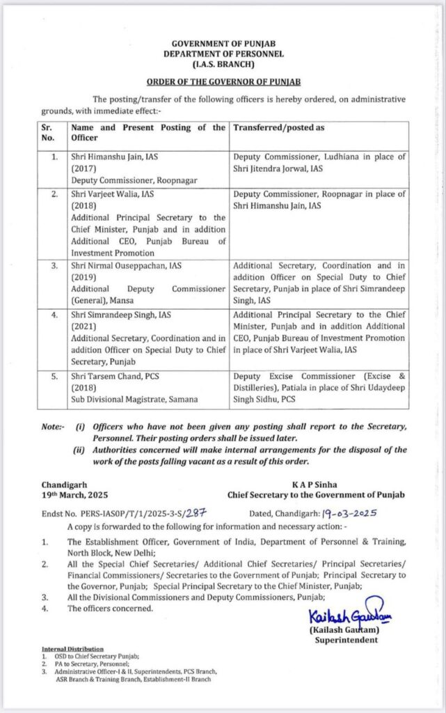 ਪੰਜਾਬ ਸਰਕਾਰ ਵੱਲੋਂ ਆਈਏਐਸ ਐਤ ਪੀਸੀਐਸ ਅਧਿਕਾਰੀਆਂ ਦੀਆਂ ਬਦਲੀਆਂ ਕੀਤੀਆਂ ਗਈਆਂ ਹਨ।