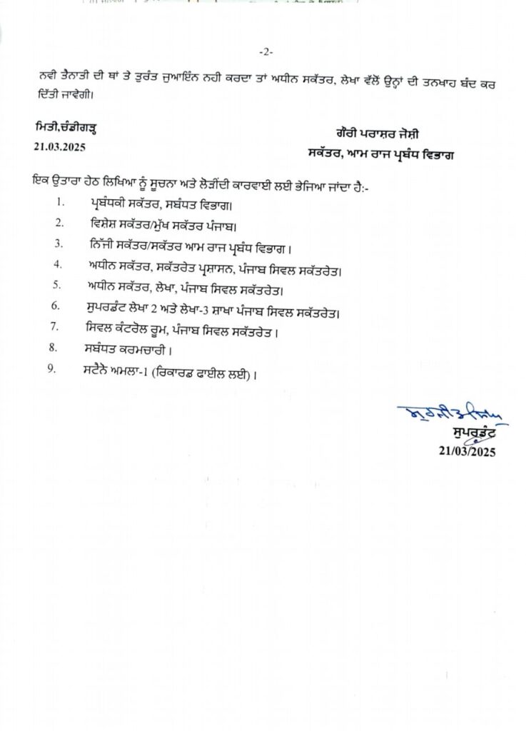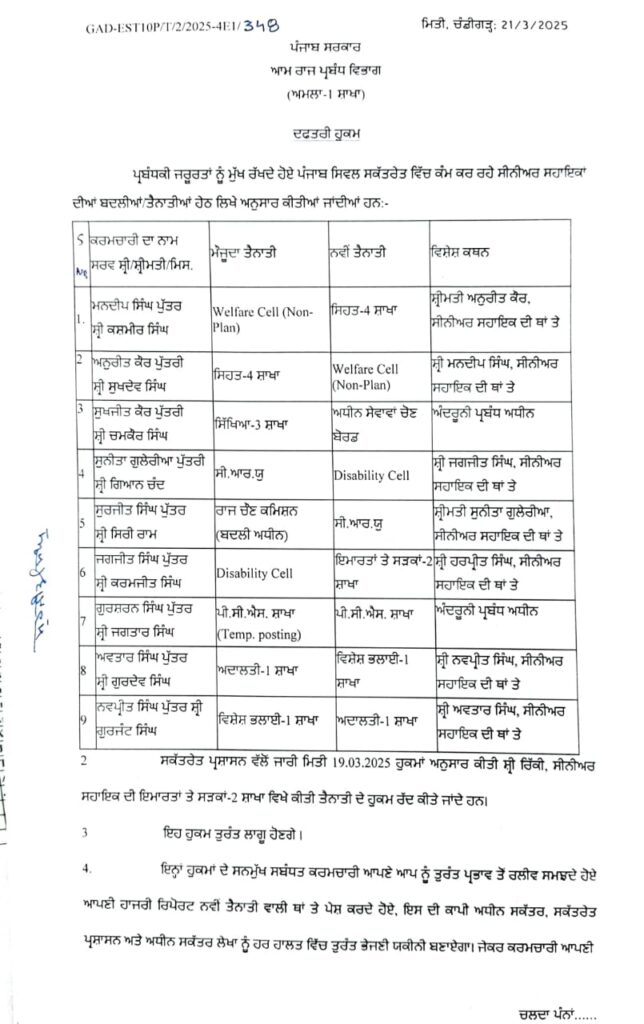 ਪੰਜਾਬ ਸਰਕਾਰ ਵੱਲੋਂ ਸਿਵਲ ਸਕੱਤਰੇਤ ਚੰਡੀਗੜ੍ਹ ਦੇ 9 ਸੀਨੀਅਰ ਸਹਾਇਕਾਂ ਦੇ ਤਬਾਦਲੇ ਪੰਜਾਬ ਮਾਰਚ 21, 2025ਮਾਰਚ 21, 2025Leave a Comment on ਪੰਜਾਬ ਸਰਕਾਰ ਵੱਲੋਂ ਸਿਵਲ ਸਕੱਤਰੇਤ ਚੰਡੀਗੜ੍ਹ ਦੇ 9 ਸੀਨੀਅਰ ਸਹਾਇਕਾਂ ਦੇ ਤਬਾਦਲੇ ਚੰਡੀਗੜ੍ਹ: 21 ਮਾਰਚ, ਦੇਸ਼ ਕਲਿੱਕ ਬਿਓਰੋ ਪੰਜਾਬ ਸਰਕਾਰ ਵੱਲੋਂ ਸਿਵਲ ਸਕੱਤਰੇਤ ਚੰਡੀਗੜ੍ਹ ਦੇ 9 ਸੀਨੀਅਰ ਸਹਾਇਕਾਂ ਦੇ ਤਬਾਦਲੇ ਕੀਤੇ ਗਏ ਹਨ।