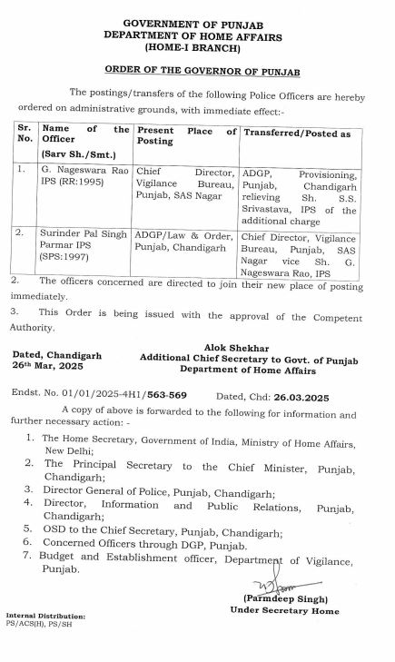 ਪੰਜਾਬ ਸਰਕਾਰ ਵੱਲੋਂ ਦੋ ਆਈਪੀਐਸ ਅਧਿਕਾਰੀਆਂ ਦੀਆਂ ਬਦਲੀਆਂ ਕੀਤੀਆਂ ਗਈਆਂ ਹਨ।