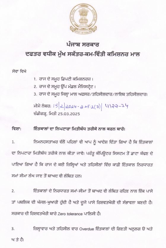 ਇੰਤਕਾਲਾਂ ਦੇ ਨਿਪਟਾਰਿਆਂ ਸਬੰਧੀ ਸਰਕਾਰ ਵੱਲੋਂ ਮਿਤੀਬੱਧ ਤਰੀਕੇ ਨਾਲ ਕਰਨ ਬਾਰੇ ਇਕ ਅਹਿਮ ਪੱਤਰ ਜਾਰੀ ਕੀਤਾ ਗਿਆ ਹੈ। ਸੂਬੇ ਦੇ ਸਾਰੇ ਡਿਪਟੀ ਕਮਿਸ਼ਨਰਜ਼, ਉਪ ਮੰਡਲ ਮੈਜਿਸਟ੍ਰੇਟ ਅਤੇ ਸਮੂਹ ਜ਼ਿਲ੍ਹਾ ਮਾਲ ਅਫਸਰ, ਤਹਿਸੀਲਦਾਰ ਅਤੇ ਨਾਇਬ ਤਹਿਸੀਲਦਾਰ ਨੂੰ ਪੱਤਰ ਜਾਰੀ ਕੀਤਾ ਹੈ। ਸਰਕਾਰ ਵੱਲੋਂ ਕਿਹਾ ਗਿਆ ਹੈ ਕਿ 4 ਅਪ੍ਰੈਲ 2025 ਤੱਕ ਸਾਰੇ Overdue ਪਏ ਇੰਤਕਾਲ ਦਾ ਕੰਮ ਖਤਮ ਕੀਤਾ ਜਾਵੇ। ਜੇਕਰ ਨਿਸ਼ਚਿਤ ਮਿਤੀ ਤੋਂ ਬਾਅਦ ਇੰਤਕਾਲ Overdue ਪਾਇਆ ਗਿਆ ਤਾਂ ਸਬੰਧਤ ਤਹਿਸੀਲਦਾਰ, ਨਾਇਬ ਤਹਿਸੀਲਦਾਰ, ਕਾਨੂੰਗੋ ਅਤੇ ਪਟਵਾਰੀਆਂ ਉਤੇ ਸਖਤ ਕਾਰਵਾਈ ਕੀਤੀ ਜਾਵੇਗੀ।