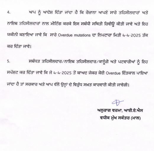 ਇੰਤਕਾਲ Overdue ਹੋਏ ਤਾਂ ਤਹਿਸੀਲਦਾਰਾਂ, ਕਾਨੂੰਗੋ ਤੇ ਪਟਵਾਰੀਆਂ ਉਤੇ ਹੋਵੇਗੀ ਕਾਰਵਾਈ